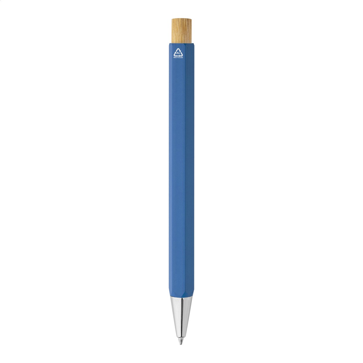 Pix hexagonal, din aluminiu reciclat, cu buton din bambus și piese cromate. Cu mină albastră.