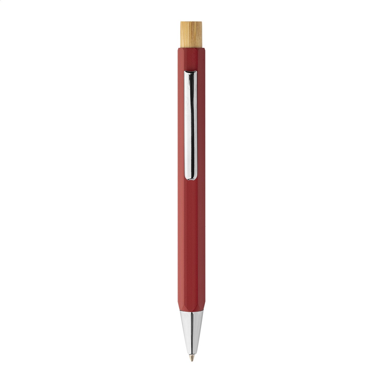 Pix hexagonal, din aluminiu reciclat, cu buton din bambus și piese cromate. Cu mină albastră.