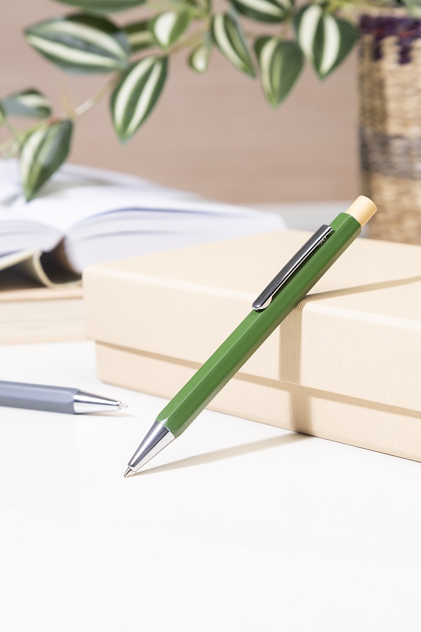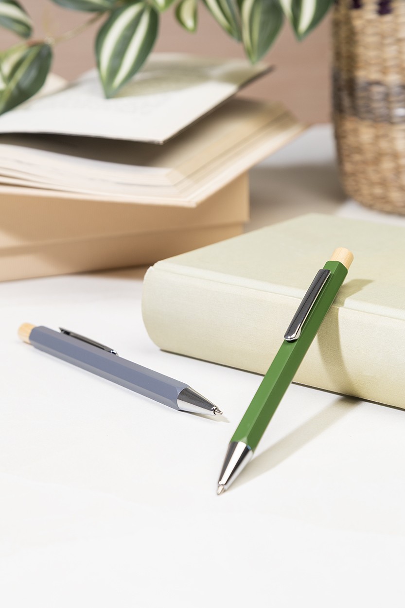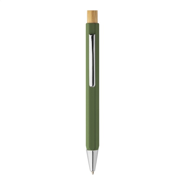 Pix hexagonal, din aluminiu reciclat, cu buton din bambus și piese cromate. Cu mină albastră.