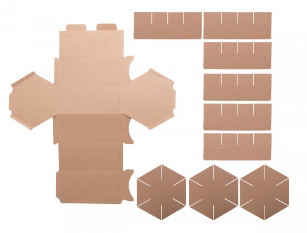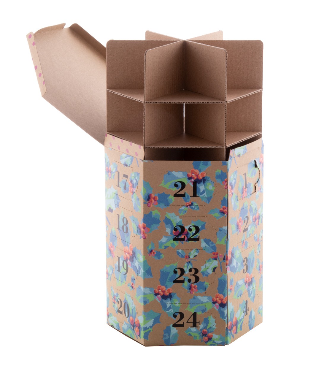 Calendar de Advent hexagonal, realizat la comandă, imprimat color, din hârtie kraft, cu 24 de compartimente. Se livreaza ambalat plat, fara dulciuri. MOQ: 50 buc.