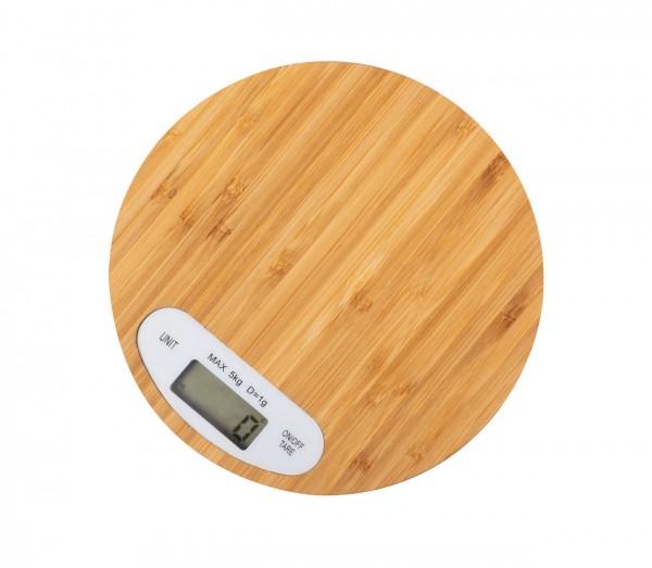 Cântar digital de bucătărie cu platformă de cântărire din bambus. Capacitate: 5 kg, gradat 1 g, unități de măsură: kg / g / oz. Baterie inclusă. În cutie de hârtie kraft.