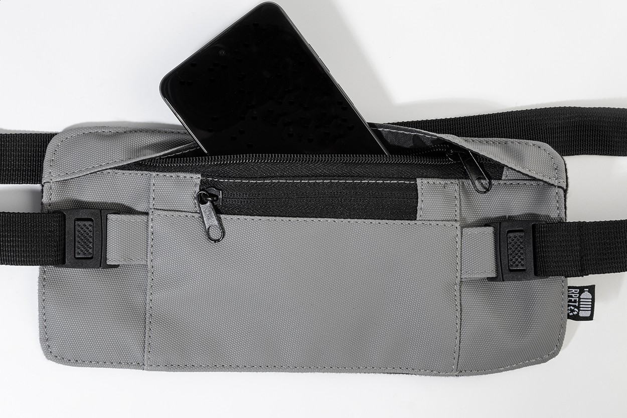 Borsetă slim, din RPET, cu partea frontală acoperită cu PU, compartiment cu fermoar și buzunar frontal, precum și curea reglabilă. Poliester RPET 600D acoperit cu PU, cu etichetă RPET distinctivă.