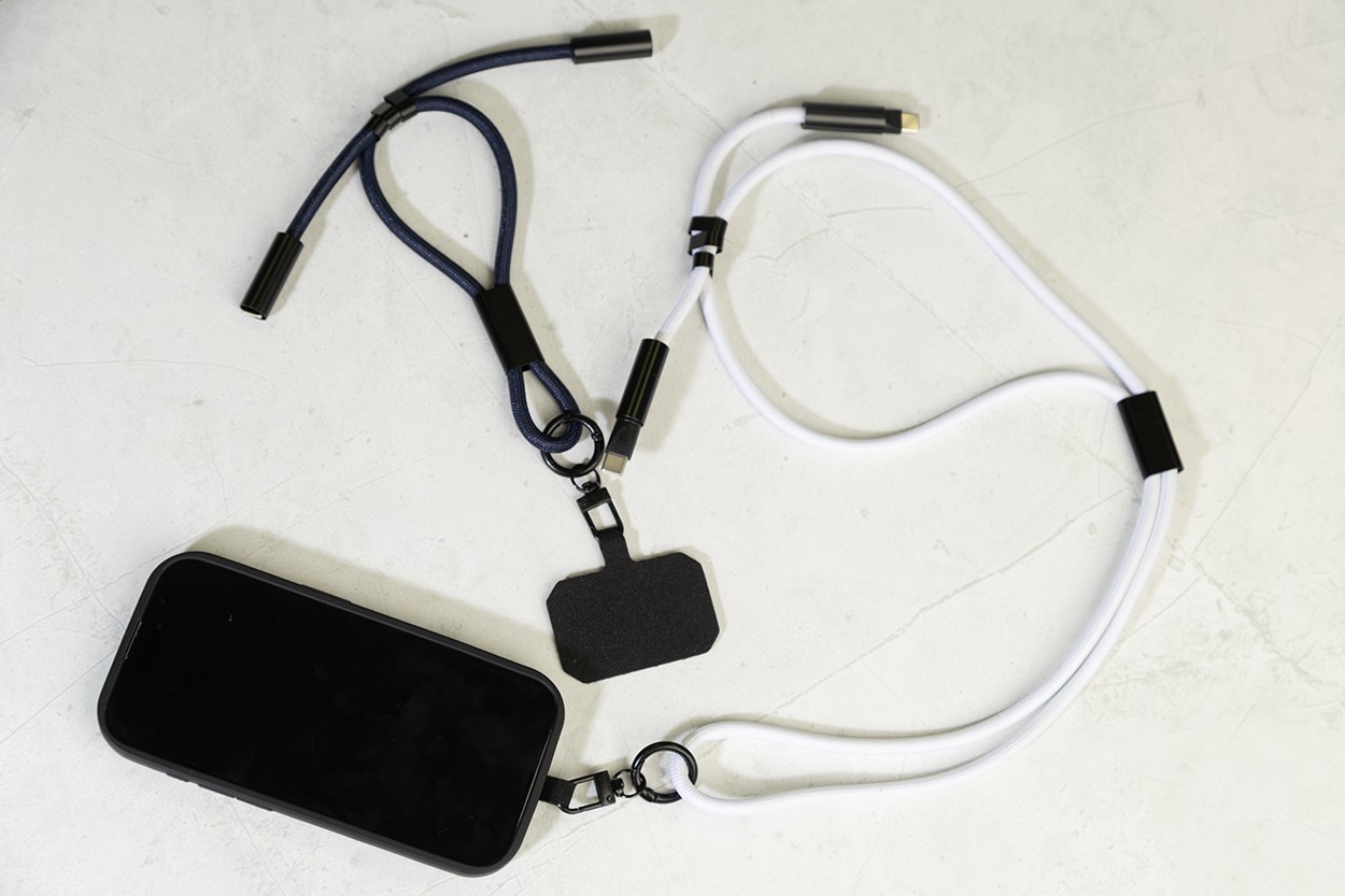Lanyard suport telefon mobil, RPET, cu inserție pentru telefon, carabină și cablu de încărcare USB-C la USB-C integrat cu conectori ascunși. Suportă încărcare rapidă PD de 60 W și transfer de date.