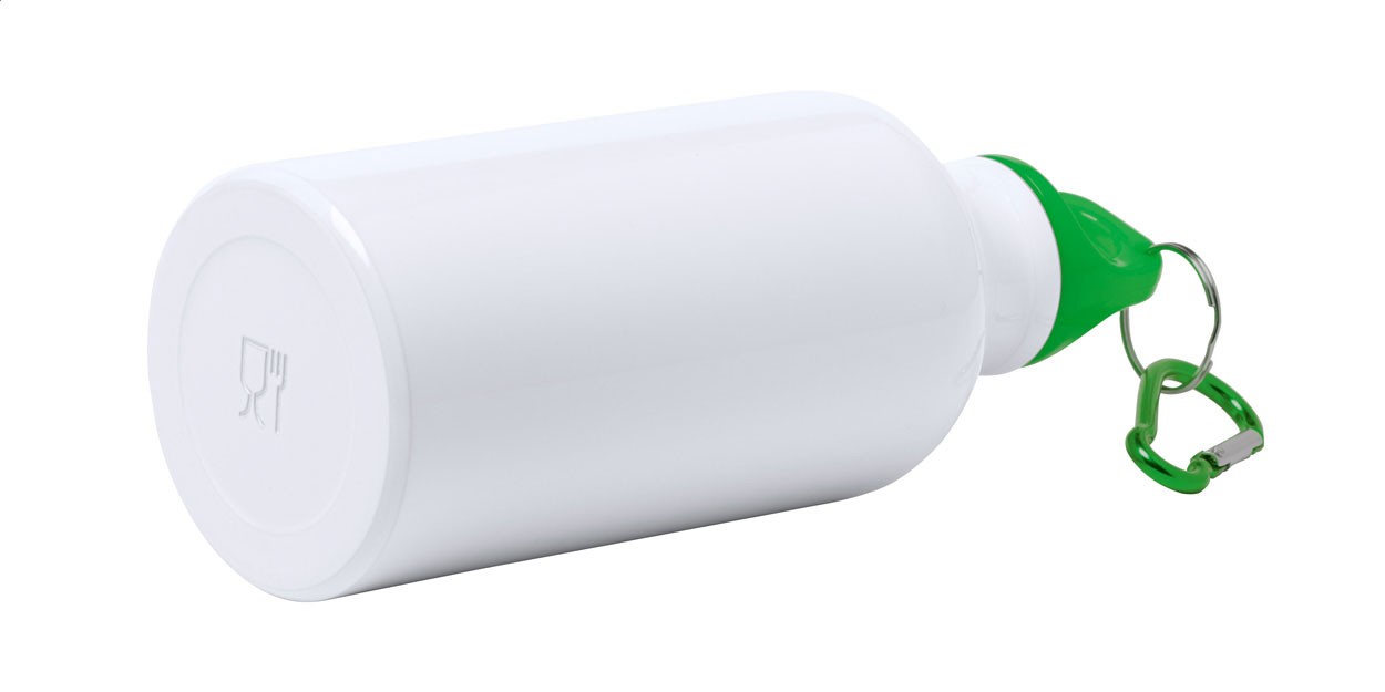 Sticlă sport din aluminiu de culoare albă, cu capac de aceeași culoare și carabină, 400 ml. Nu este potrivită pentru băuturi carbogazoase.