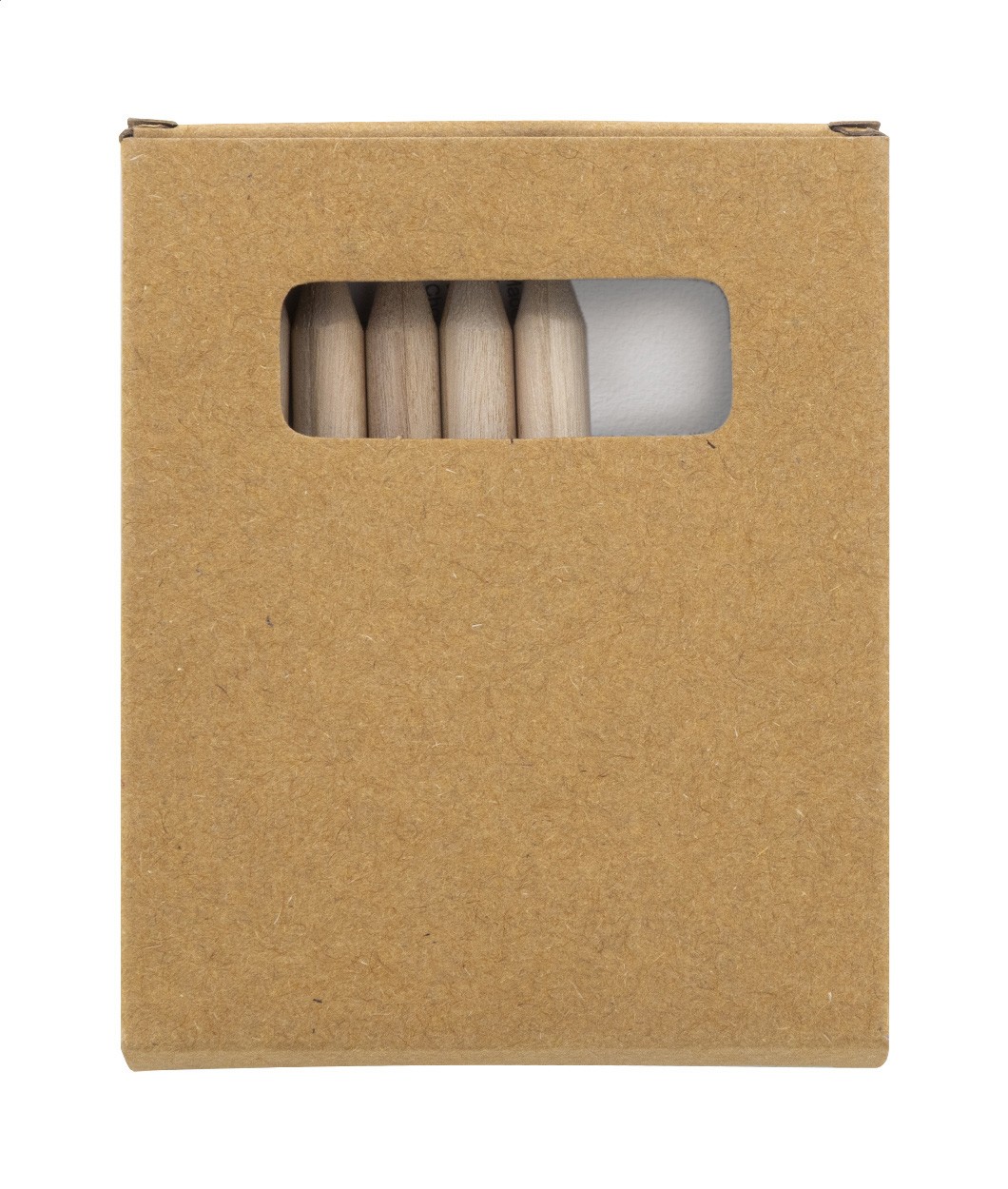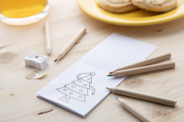Set de colorat, design de Crăciun, cu 6 creioane colorate din lemn, ascuțitoare și broșură de colorat. În cutie de hârtie kraft.