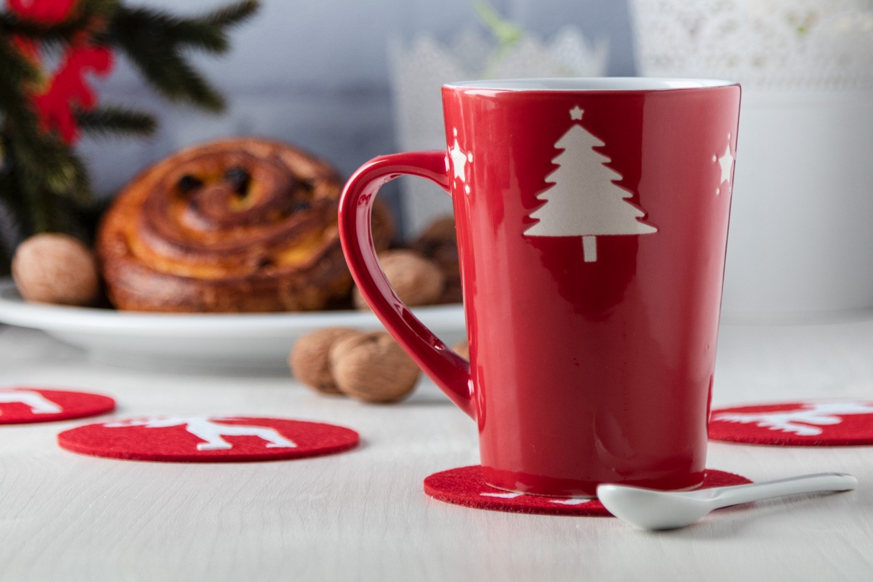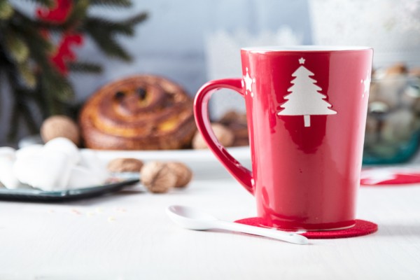Cană roșie din ceramică, cu linguriță, cu design de Crăciun, 350 ml. În cutie alba de carton.