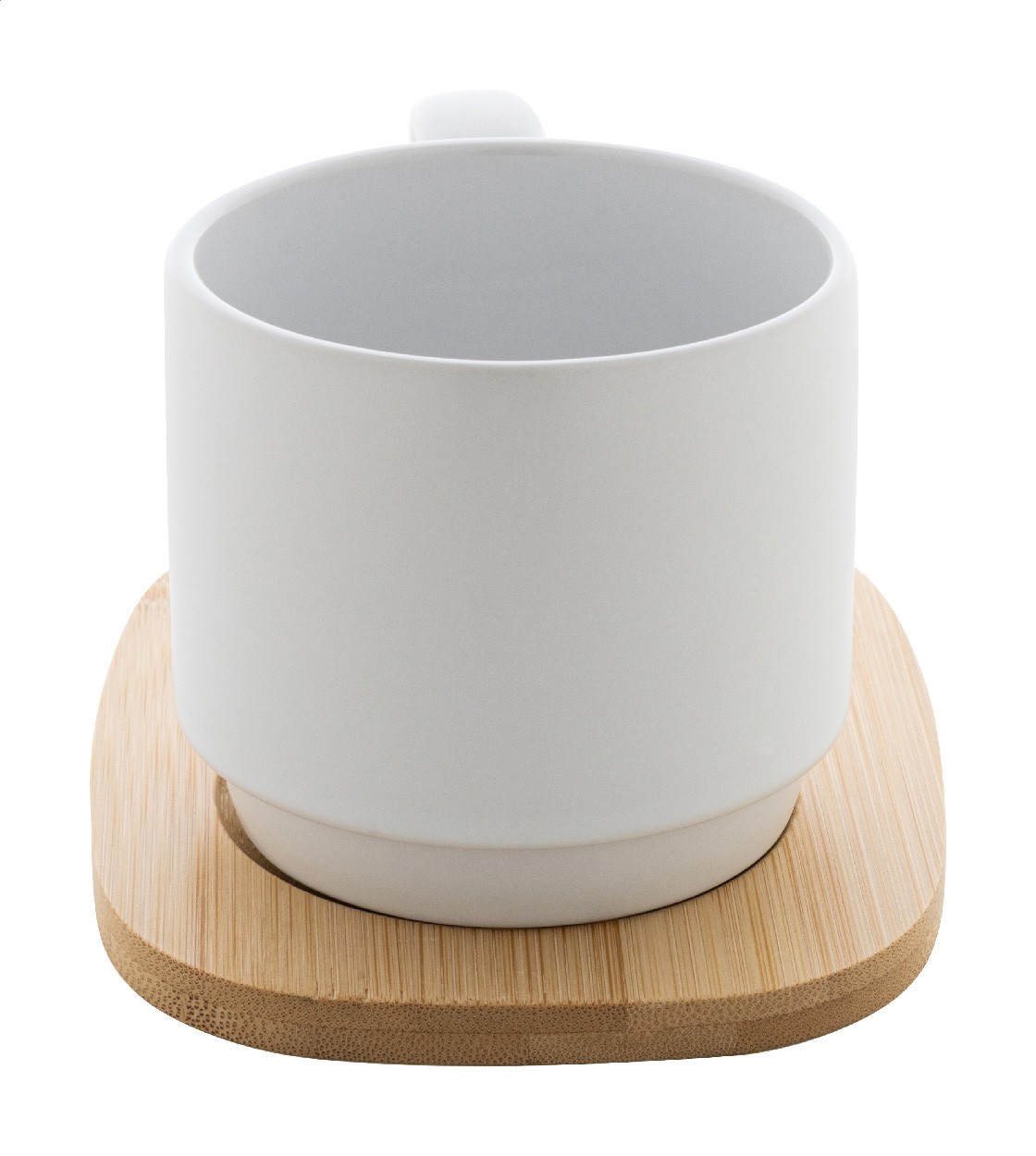 Cană ceramică, de înaltă calitate, cu finisaj exterior mat și interior lucios. Include tavă de servire din bambus. 220 ml. În cutie de hârtie kraft.