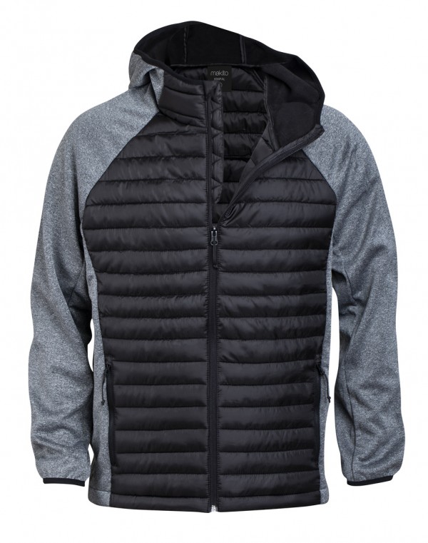 Jachetă respirabilă, rezistentă la vânt și la apă, cu fermoar, în combinație softshell-poliester, cu glugă și buzunare laterale cu fermoar.