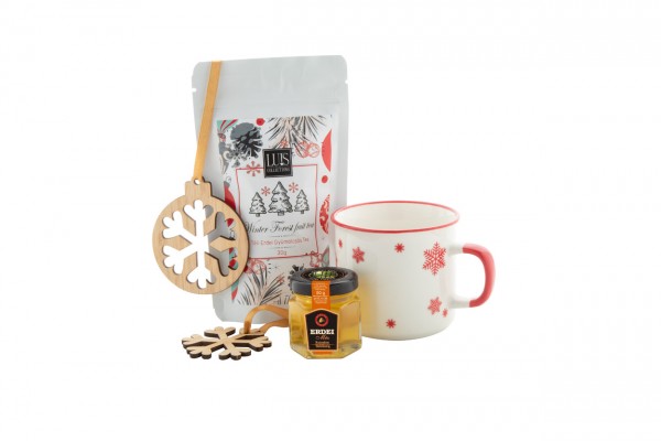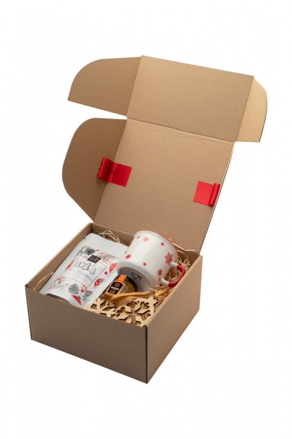Set cadou cu ceai, în cutie cadou din carton kraft, cu umplutură de lână de lemn și panglică roșie. Include: cană de Crăciun „Nakkala”; Ceai de fructe de pădure „Luis” (30 g); Miere de pădure „Always Gourmet” (50g); "Jerpstad" 2 în 1 ornament pentru brad.