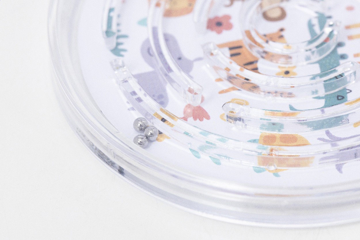 Joc labirint rotund, din PS reciclat, cu trei bile metalice. Cu inserție personalizată din hârtie color. Prețul include imprimare digitală pe ambele părți. MOQ: 100 buc.