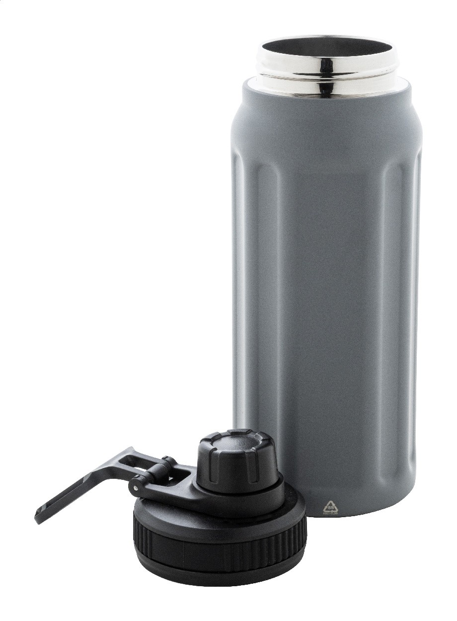 Sticlă termică cu perete dublu, din oțel inoxidabil reciclat, cu caneluri verticale. Dispune de un capac din PP cu mâner de transport integrat. 540 ml.