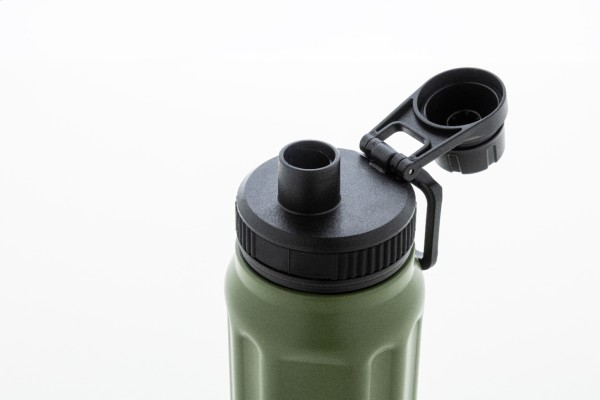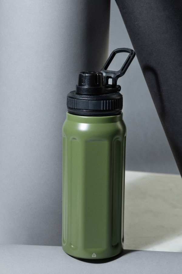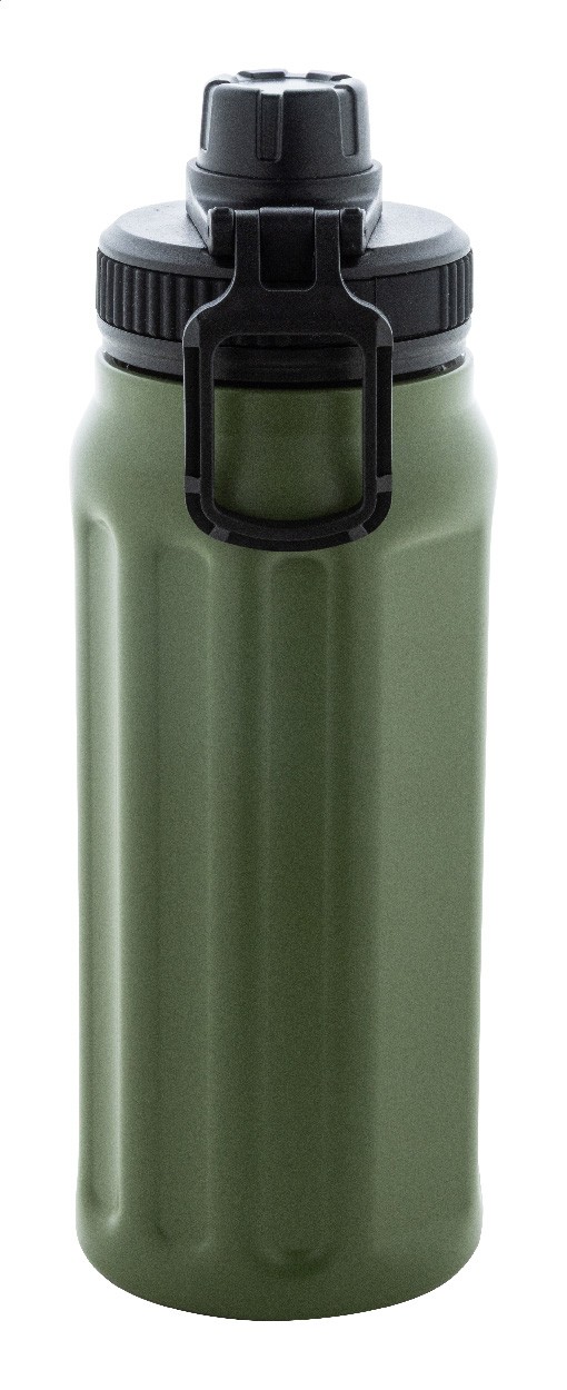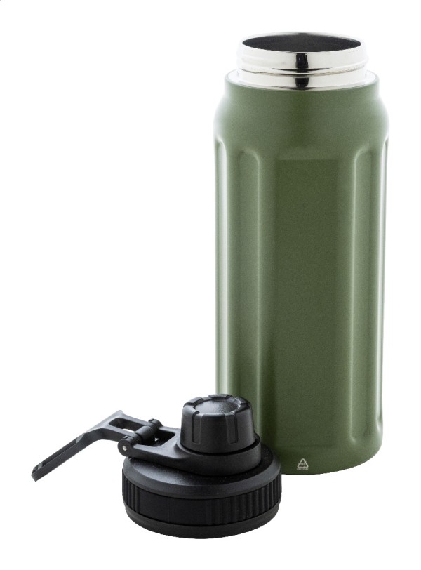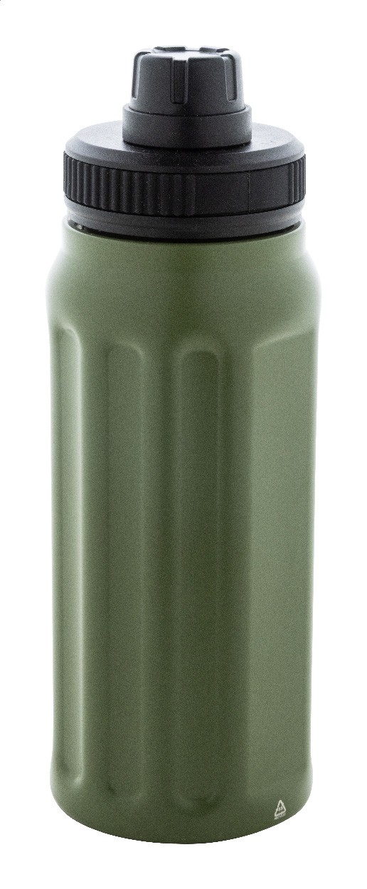 Sticlă termică cu perete dublu, din oțel inoxidabil reciclat, cu caneluri verticale. Dispune de un capac din PP cu mâner de transport integrat. 540 ml.