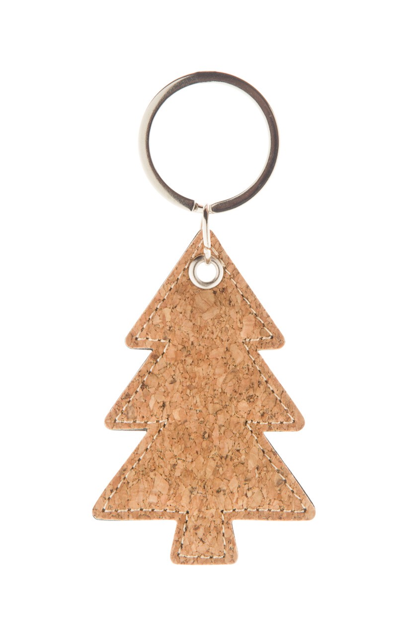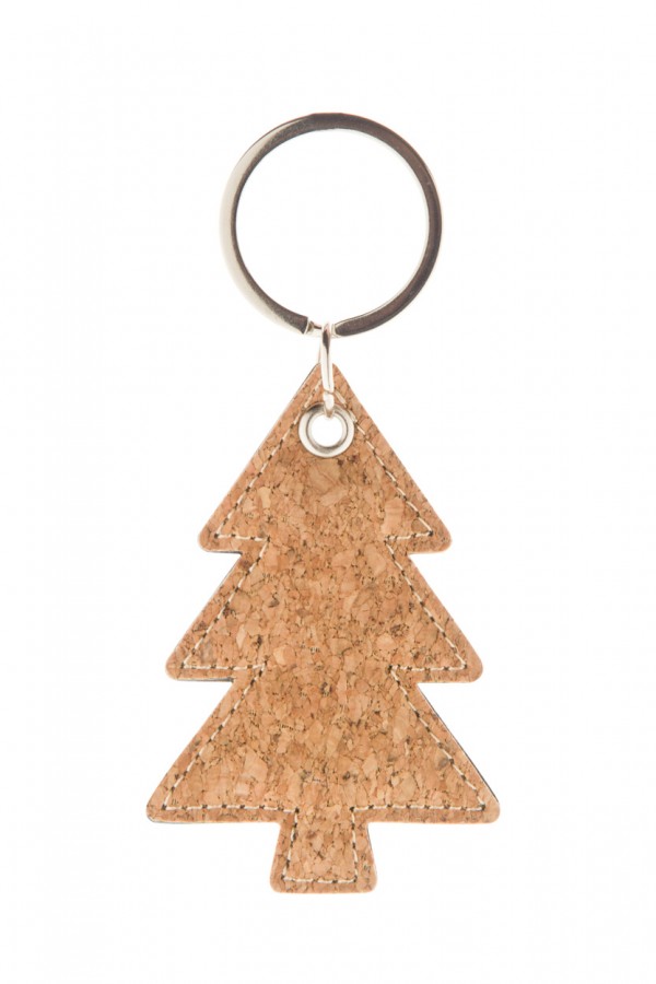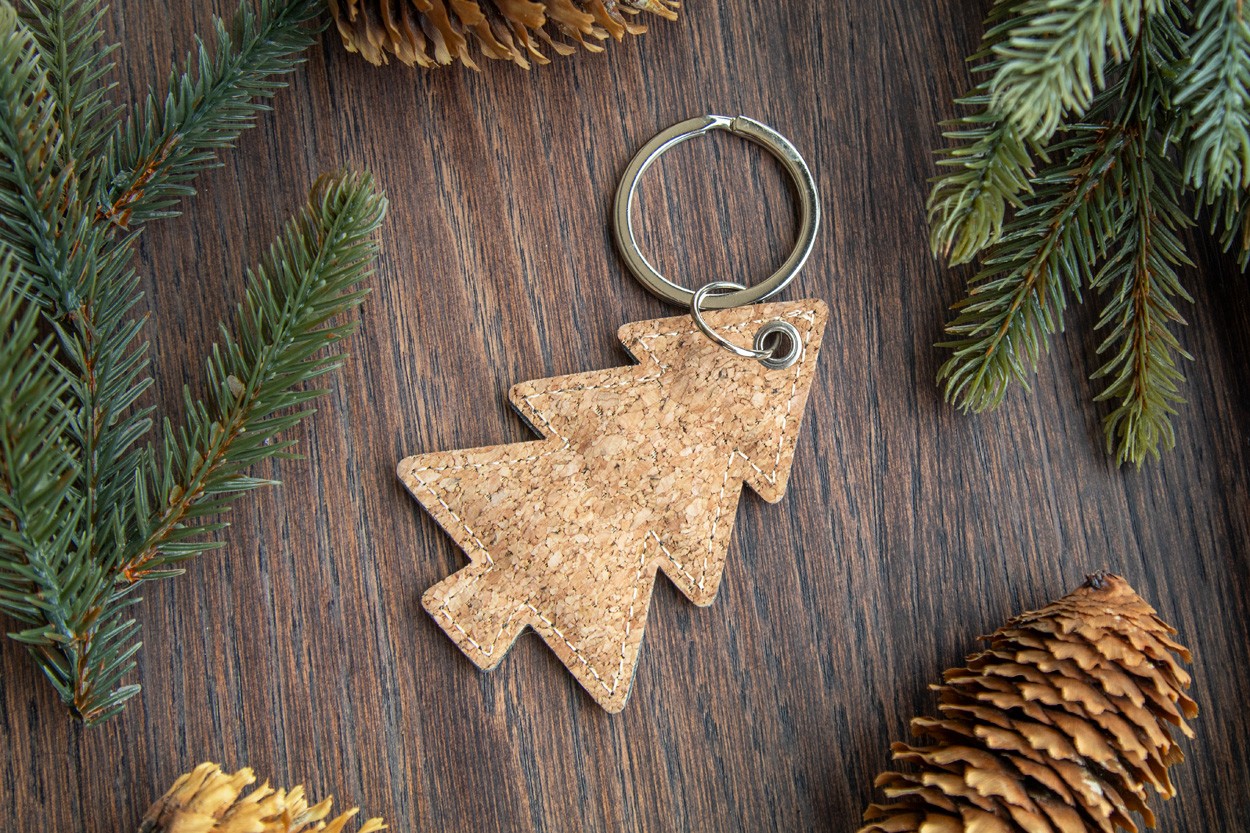 Breloc din plută naturală și piele PU, în formă de brad cu inel metalic.