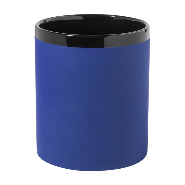 Cana din ceramică, cu finisaj cauciucat moale la atingere și interior și margine negre, 300 ml. Cu acoperire specială pentru gravare, logo-ul gravat se potrivește cu culoarea interiorului. În cutie din hârtie kraft.