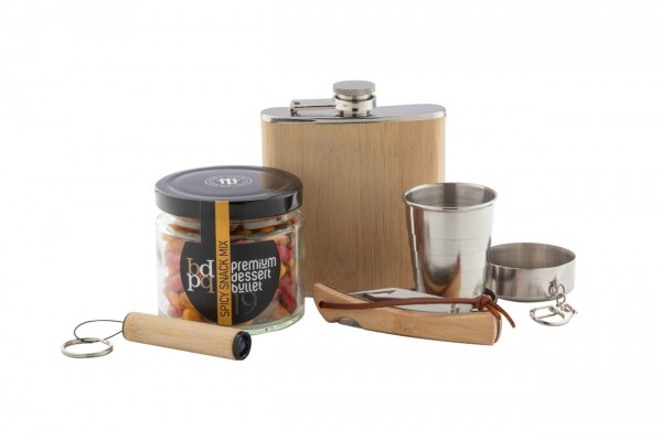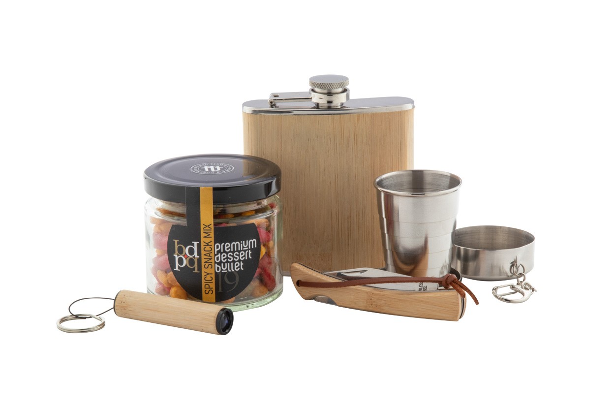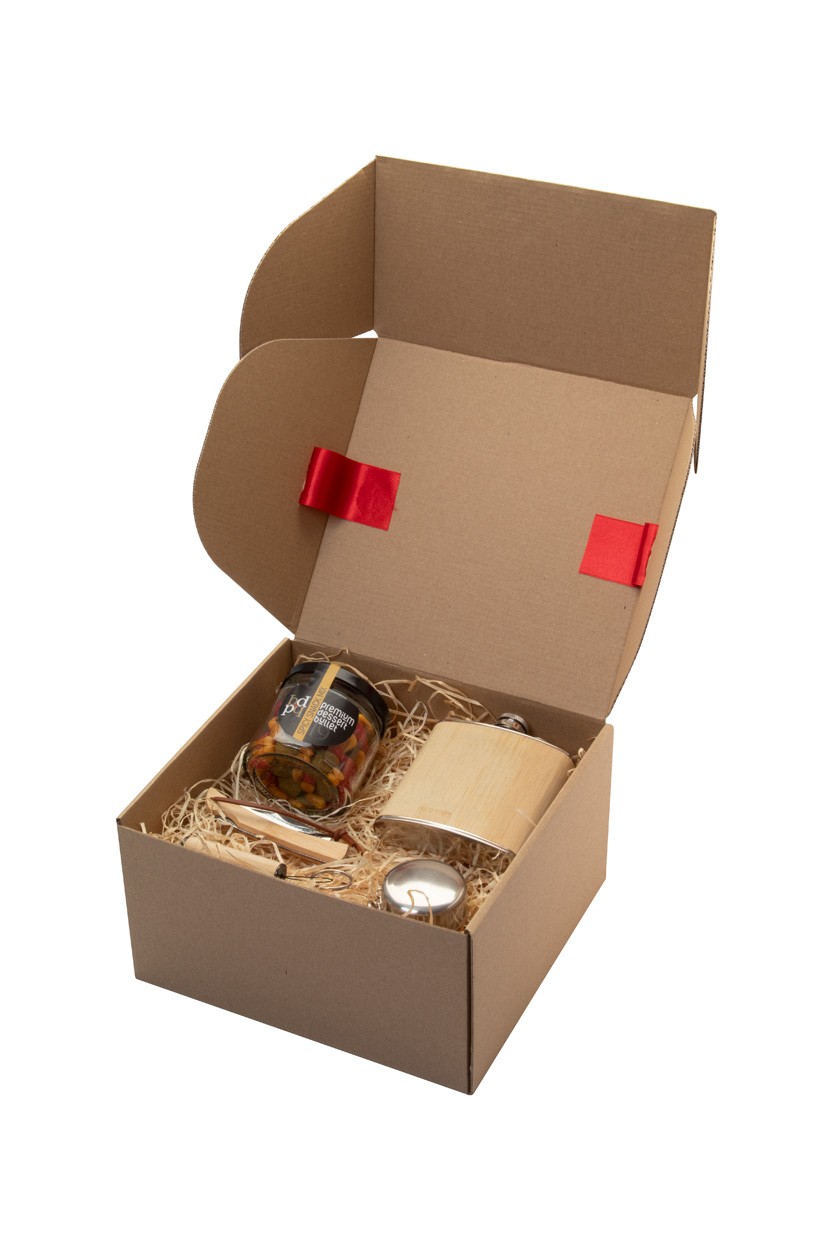 Set cadou Spirit, în cutie cadou din carton kraft, cu umplutură de lână de lemn și panglică roșie. Include: butelcă de șold „Borester”; ceașcă pliabilă „Nautilus”; Mix de gustări „Premium Dessert Bullet” (80 g); Cuțit de buzunar „Sultan”; Lanternă din bambus „Lampoo”.