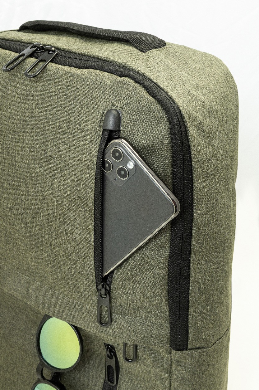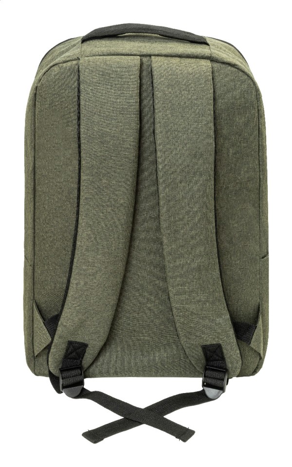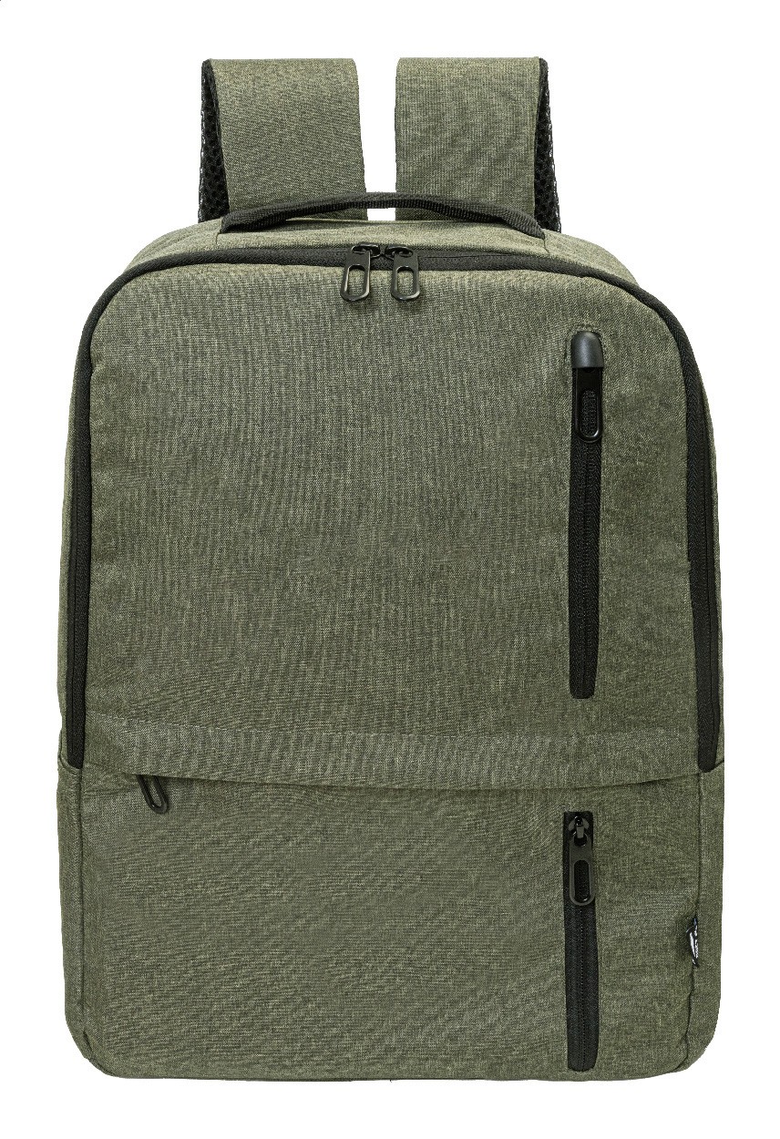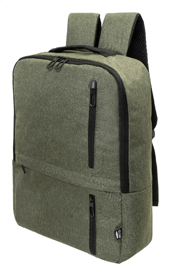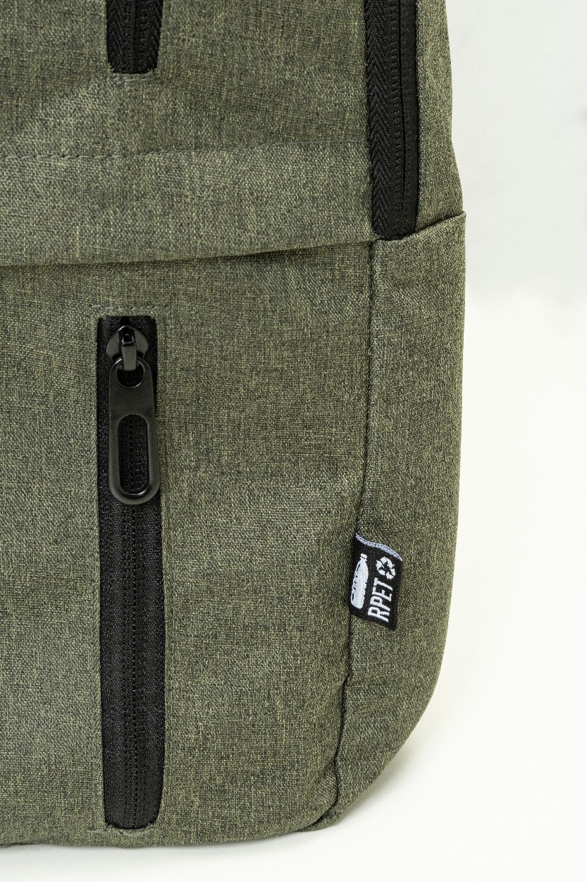 Rucsac din RPET, cu compartiment principal cu fermoar și 3 buzunare frontale cu fermoar. Cu compartimente căptușite pentru tabletă (10") și laptop (15"), bretele căptușite pentru spate și umăr. Poliester RPET 600D, cu etichetă distinctivă RPET.