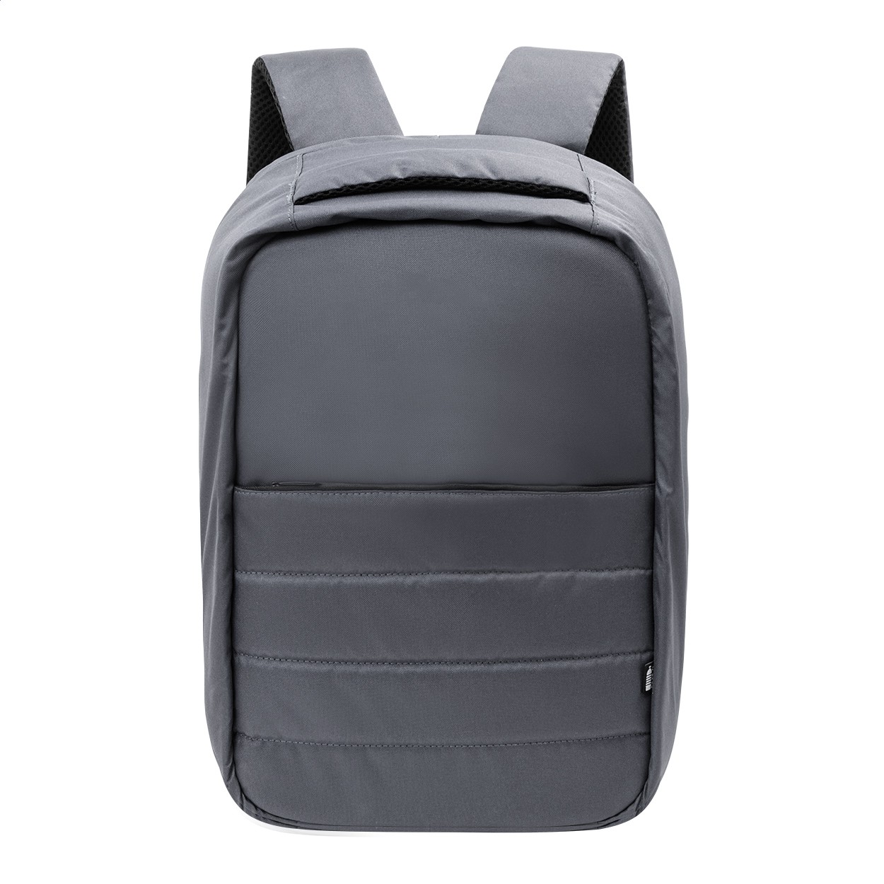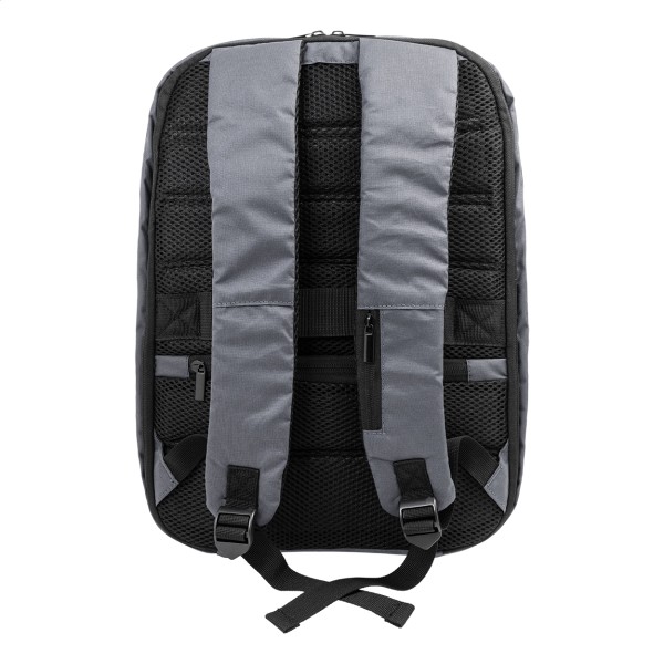 Rucsac antifurt, din RPET, cu compartiment cu fermoar, compartiment căptușit pentru laptop (15„) și tabletă (12”), curea pentru troler, spate și curele pentru umeri căptușite. Cu buzunar antifurt ascuns. Poliester RPET 300D. Cu etichetă RPET distinctivă.