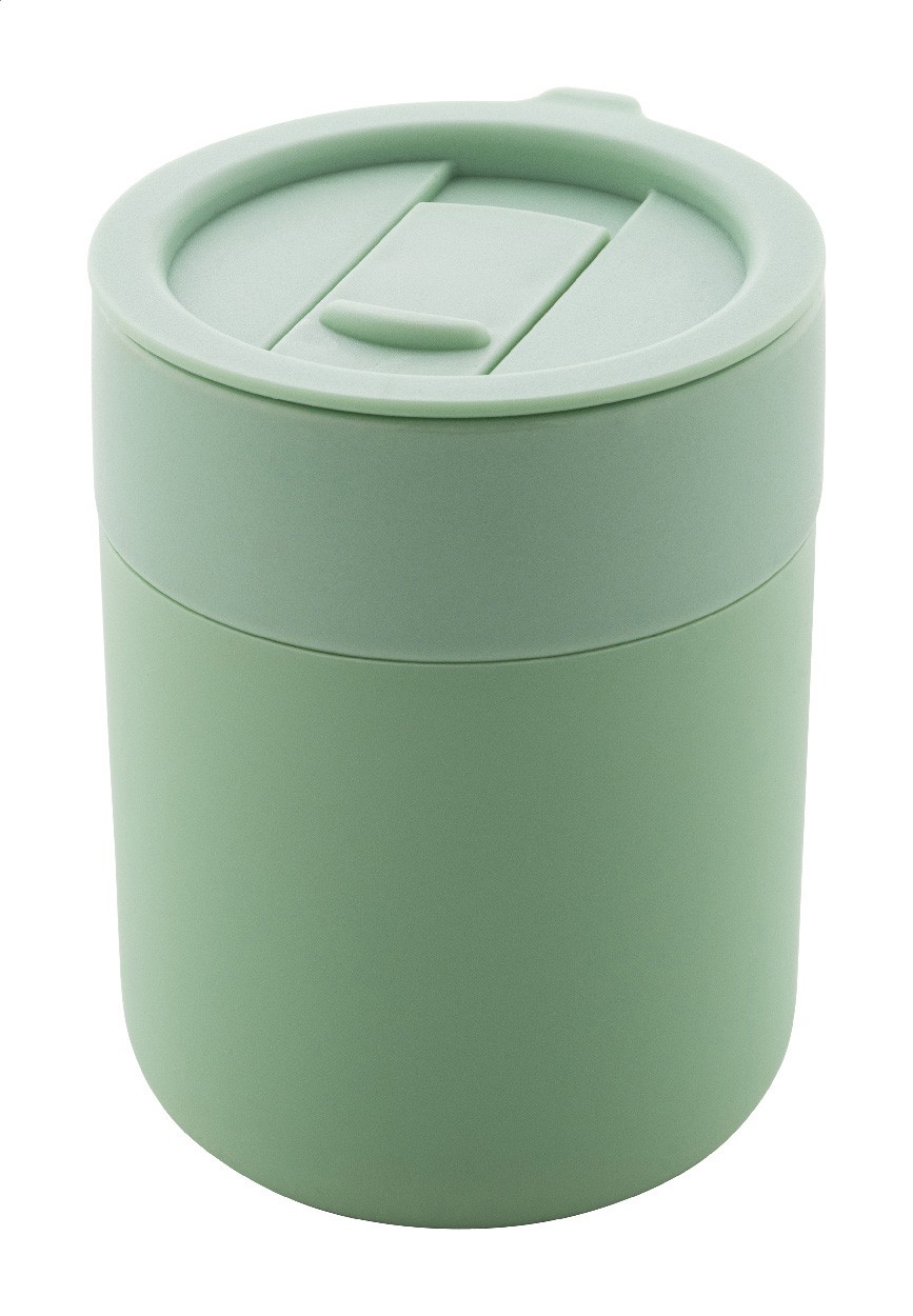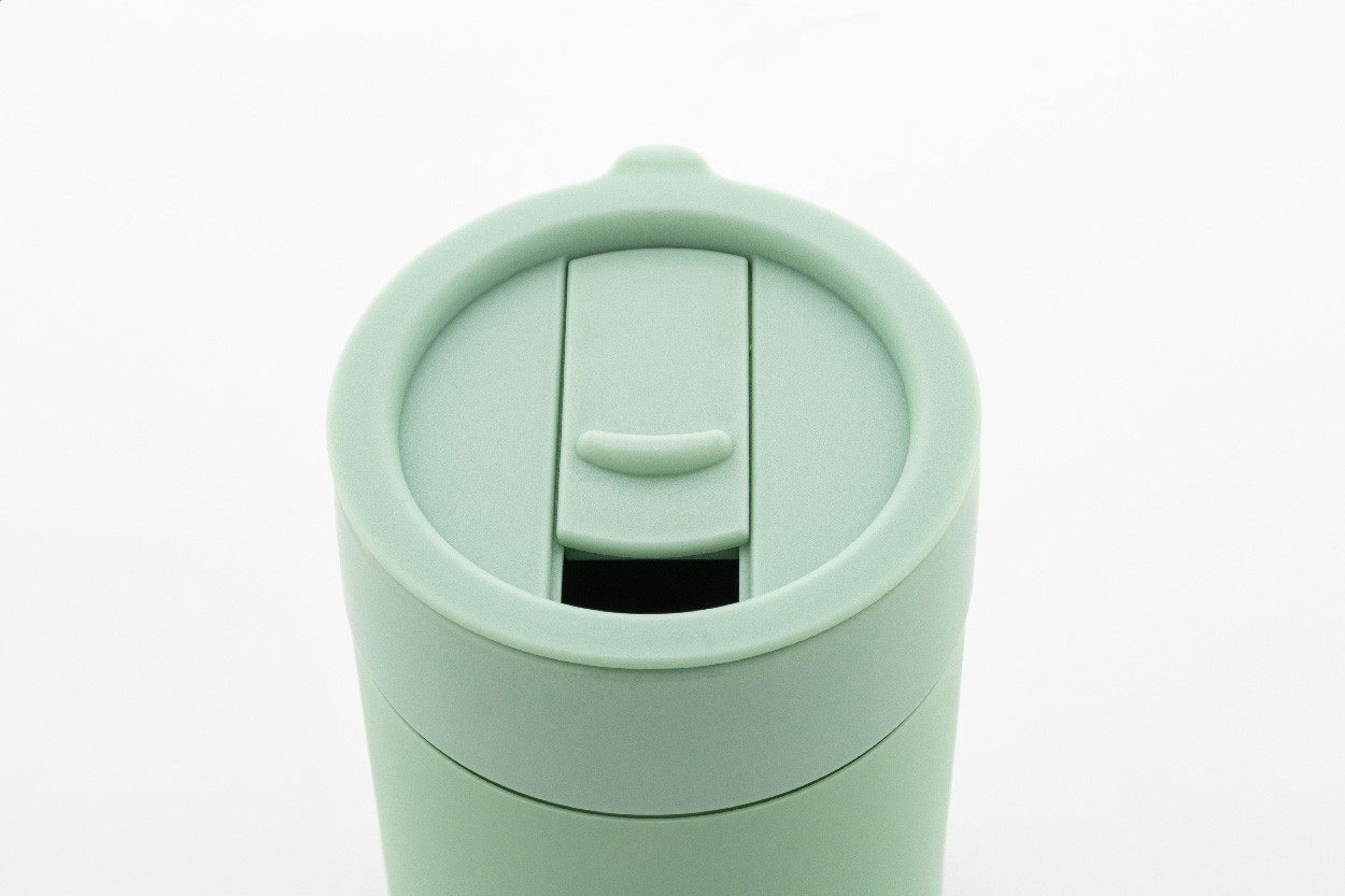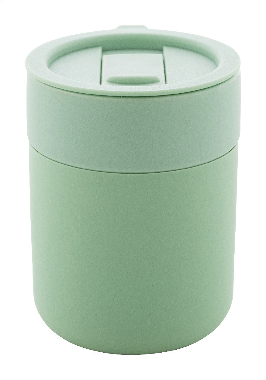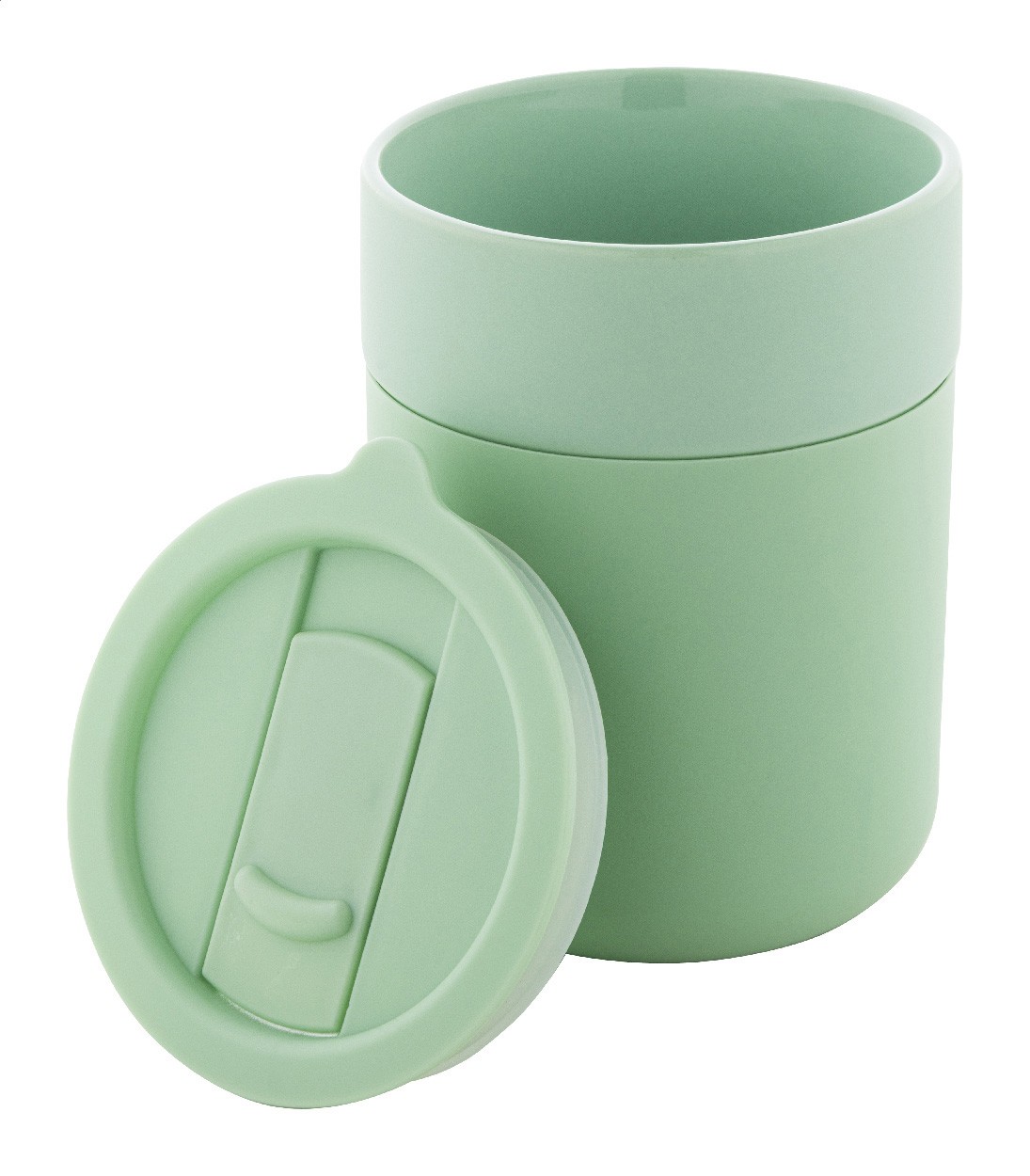 Cană de călătorie, din ceramică, acoperită cu silicon, cu capac de băut din plastic PP. 300 ml.
