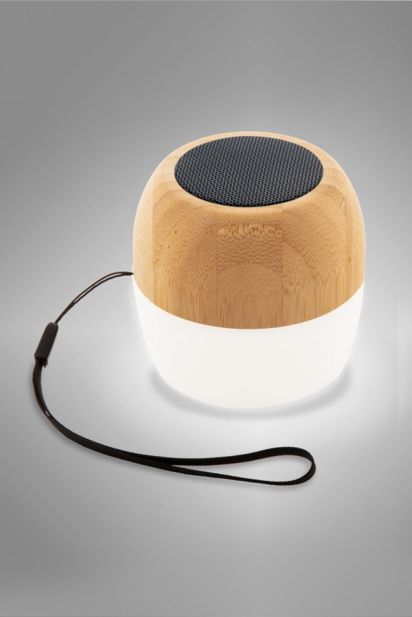 Difuzor wireless din plastic ABS reciclat și carcasă din bambus cu lumină LED multicoloră în partea de jos. Cu curea de transport și baterie reîncărcabilă încorporată. Inclusiv cablu de încărcare USB.
