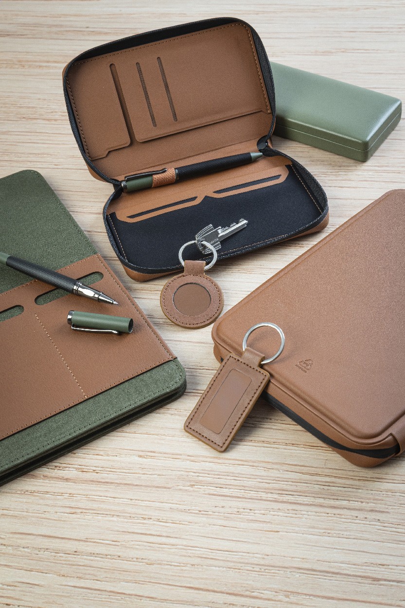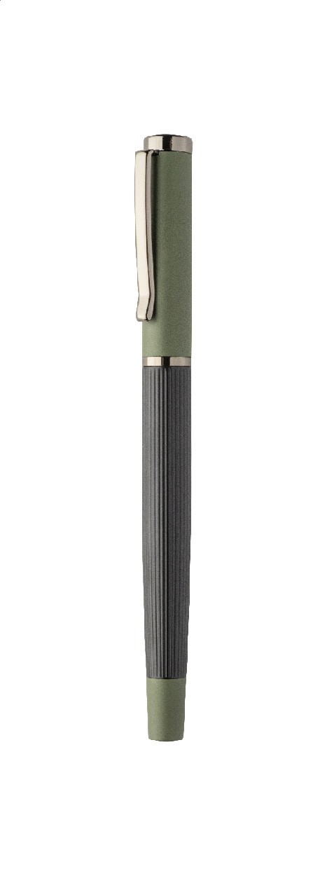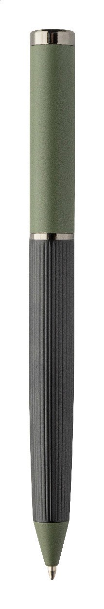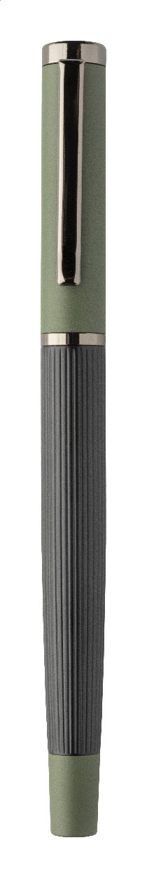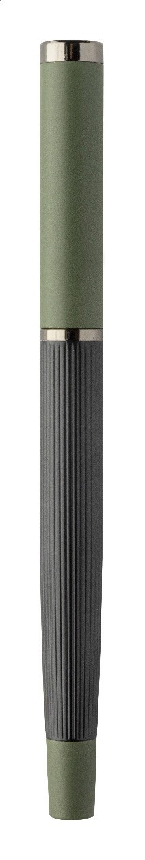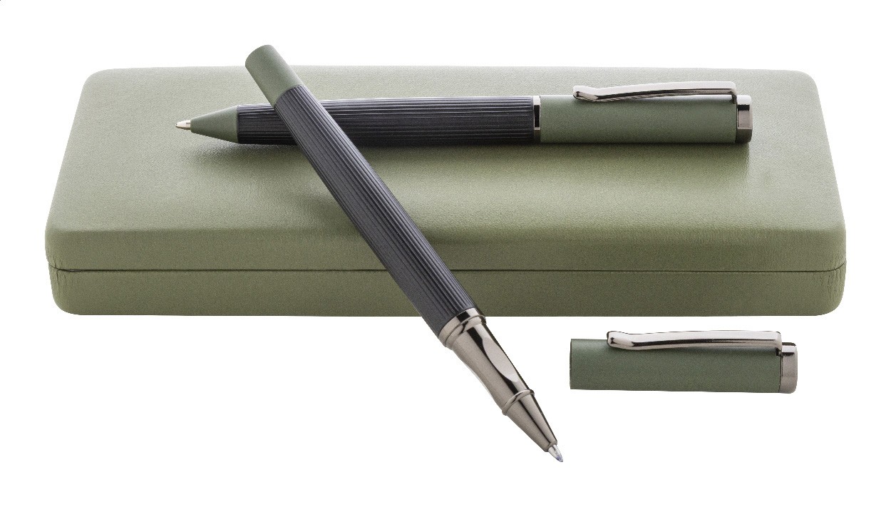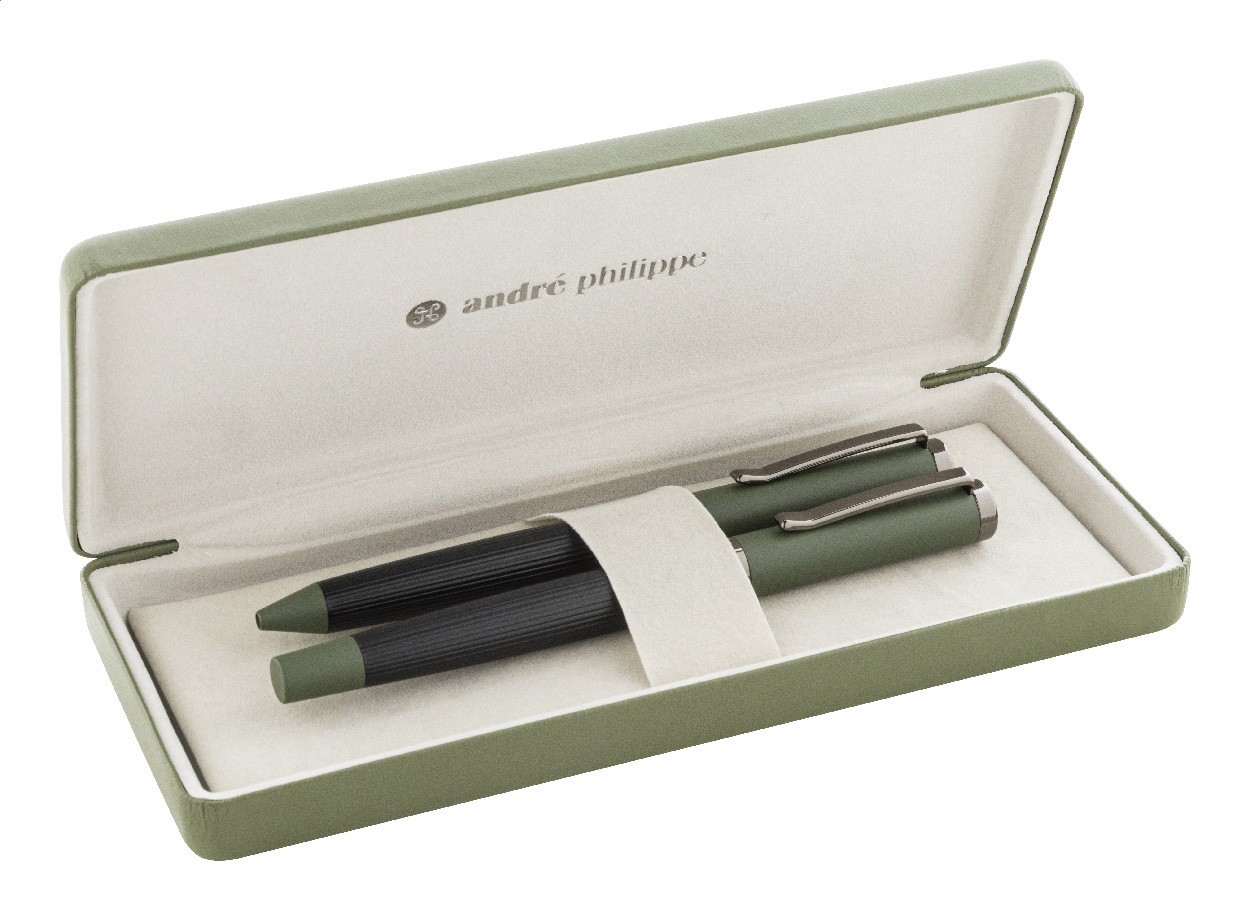 Set elegant de pix și roller, din metal, cu bară în dungi, accente colorate și detalii metalice strălucitoare. În cutie cadou de culoare asortată, cu mină albastră. Produs marca André Philippe.