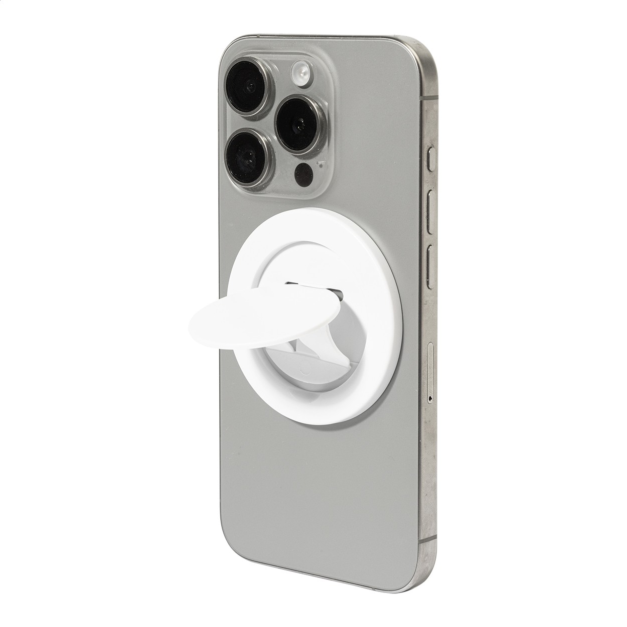 Suport magnetic pentru telefon mobil, din ABS reciclat. Include inel metalic autoadeziv pentru telefoane fără suprafață magnetică.