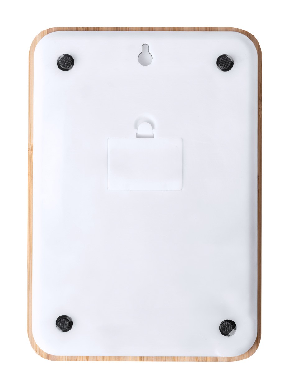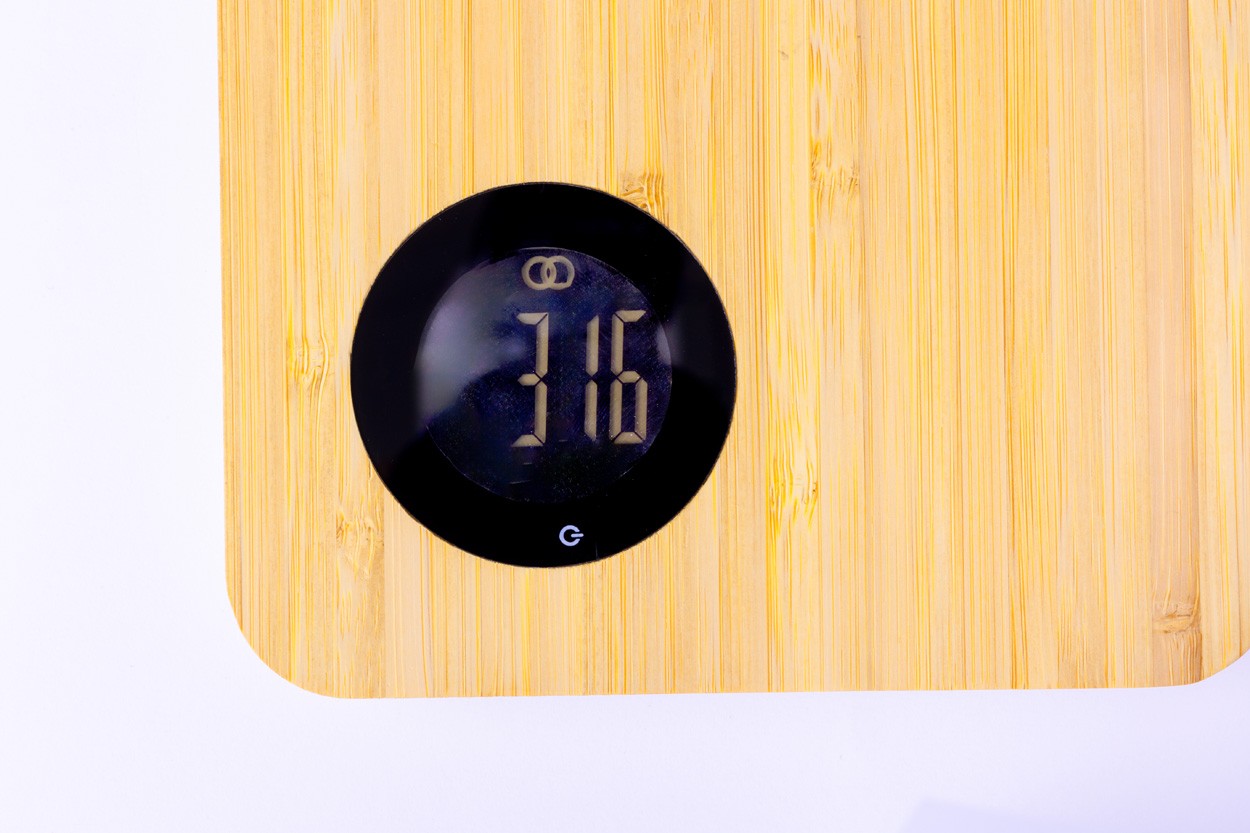 Tocător din bambus, cu bază anti-alunecare, funcție de cântar digital de bucătărie și afișaj LCD. Capacitate: 5 kg. Funcționează cu 2 baterii AAA, livrat fără baterii.