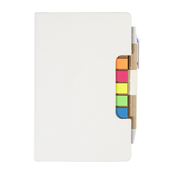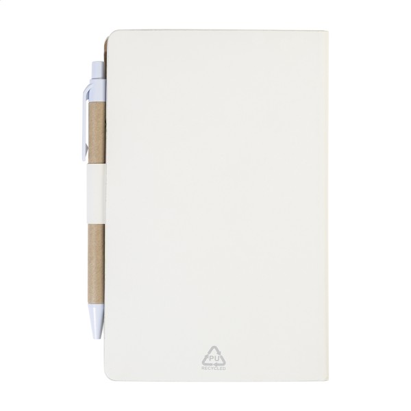Caiet cu copertă din piele PU reciclată, cu 70 de file dictando, din hârtie reciclată și 125 de marcaje de pagină (în 5 culori diferite). Include hârtie reciclată și pix din PP reciclat cu refill albastru.