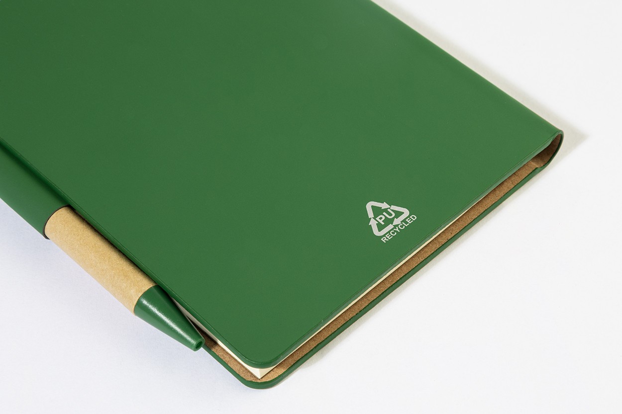 Caiet cu copertă din piele PU reciclată, cu 70 de file dictando, din hârtie reciclată și 125 de marcaje de pagină (în 5 culori diferite). Include hârtie reciclată și pix din PP reciclat cu refill albastru.