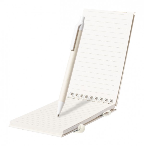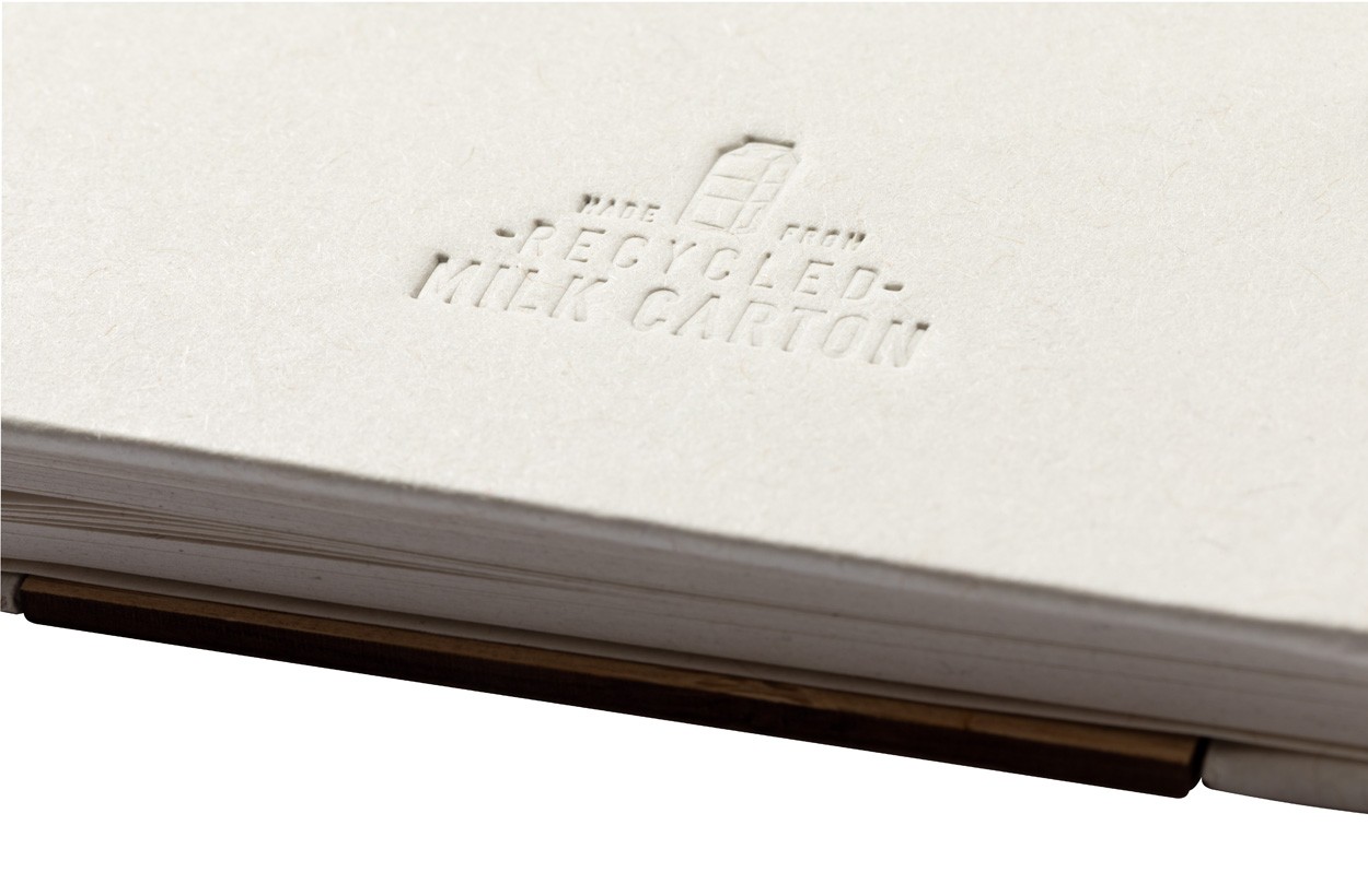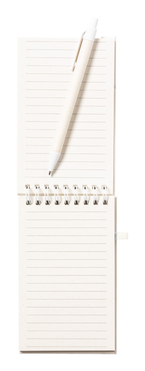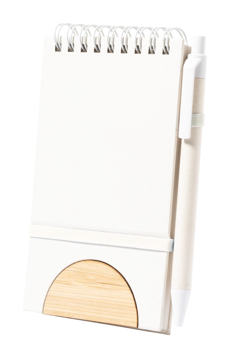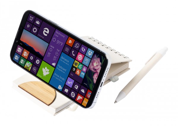 Agendă spiralată, acoperită cu carton provenit din reciclarea cutiilor de lapte, cu inserție din bambus, funcție de suport pentru telefon mobil și suport pentru stilouri. Cu 80 de foi dictando, inclusiv un pix în cutie provenită din reciclarea cutiilor de lapte, cu mină albastră.