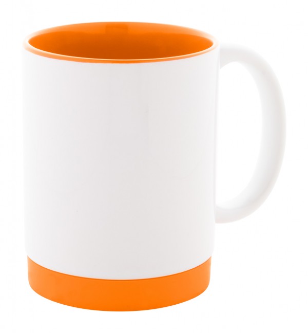 Cană pentru sublimare din ceramică, cu interior colorat și inel din silicon de culoare asortată, în partea de jos, 300 ml. În cutie de hârtie albă.