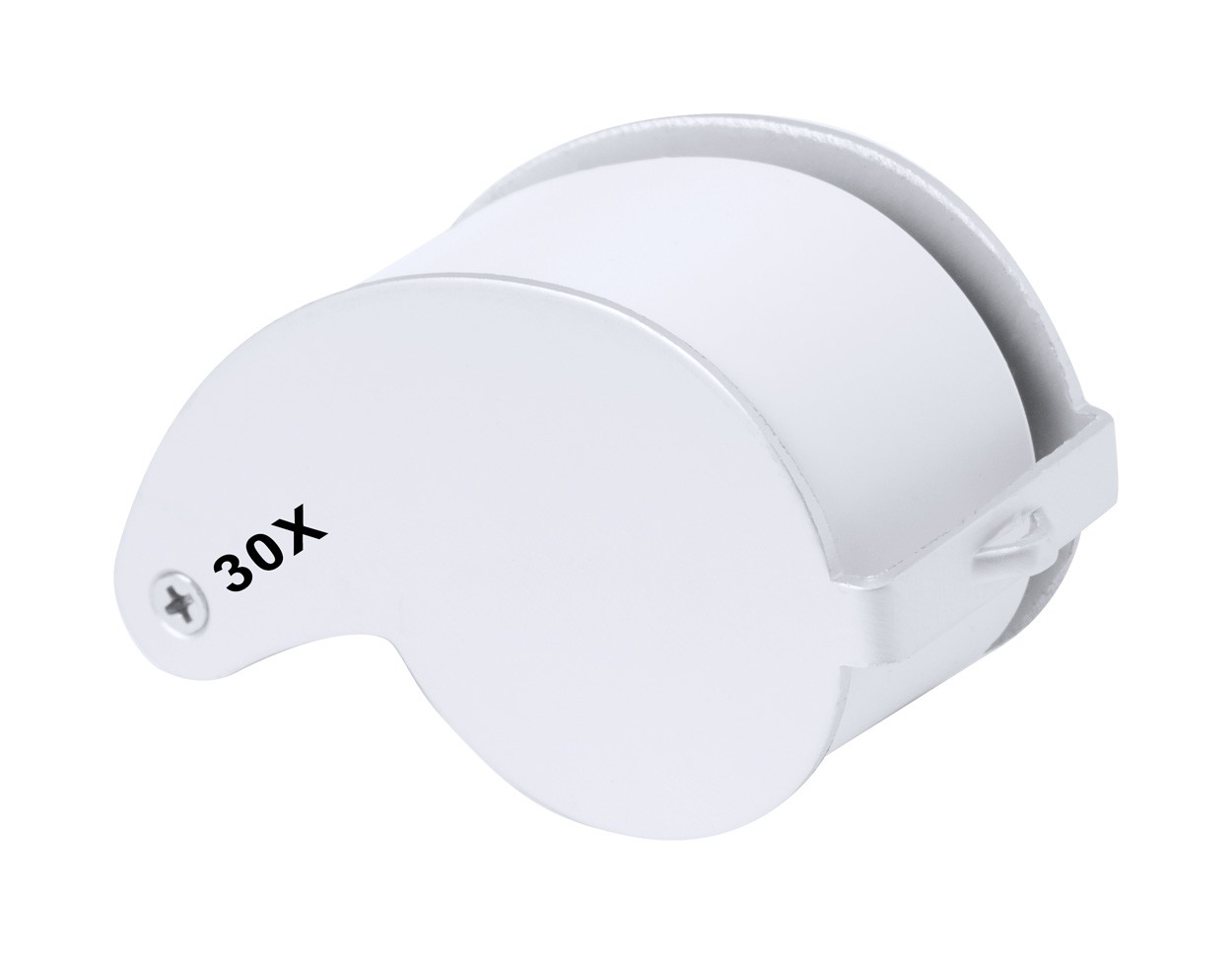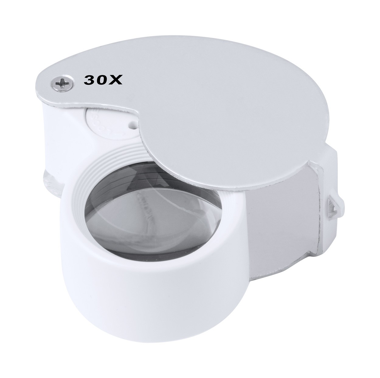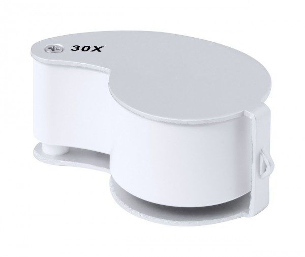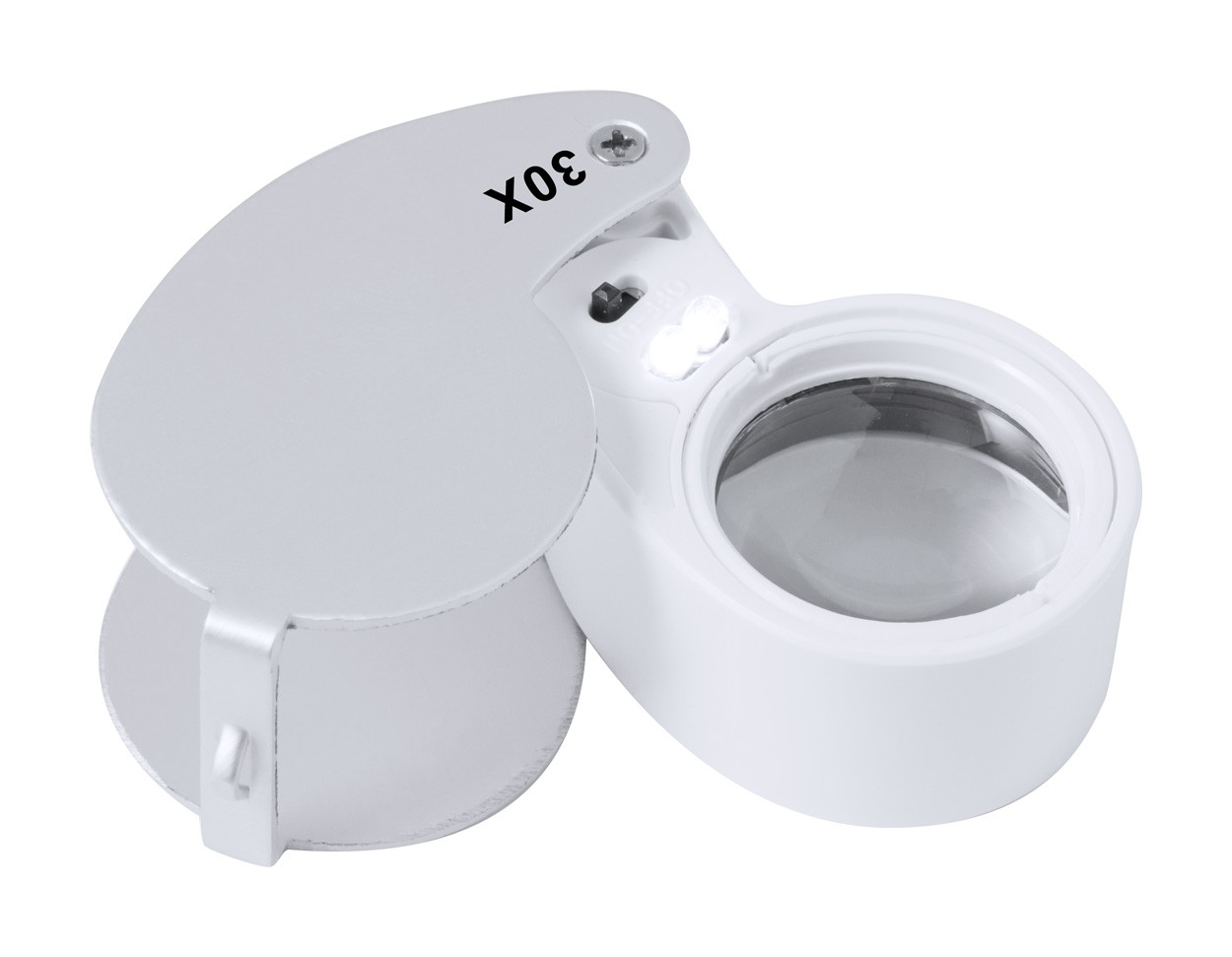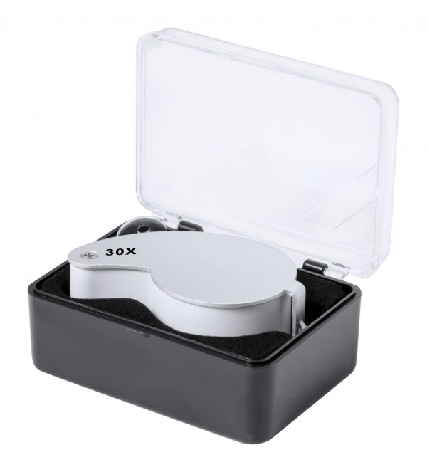 Foldable magnifier in ABS plastic and metal, with 2 LEDs. Including button cell batteries.