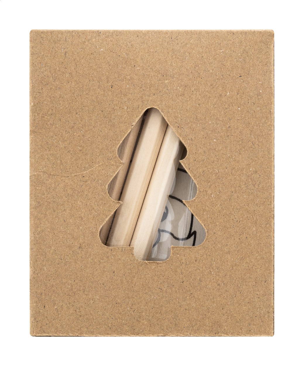 Set de ornamente de Crăciun, de colorat, în cutie de hârtie kraft, cu brad de Crăciun decupat. Include 3 ornamente din lemn cu șnur de cânepă și 4 creioane colorate.