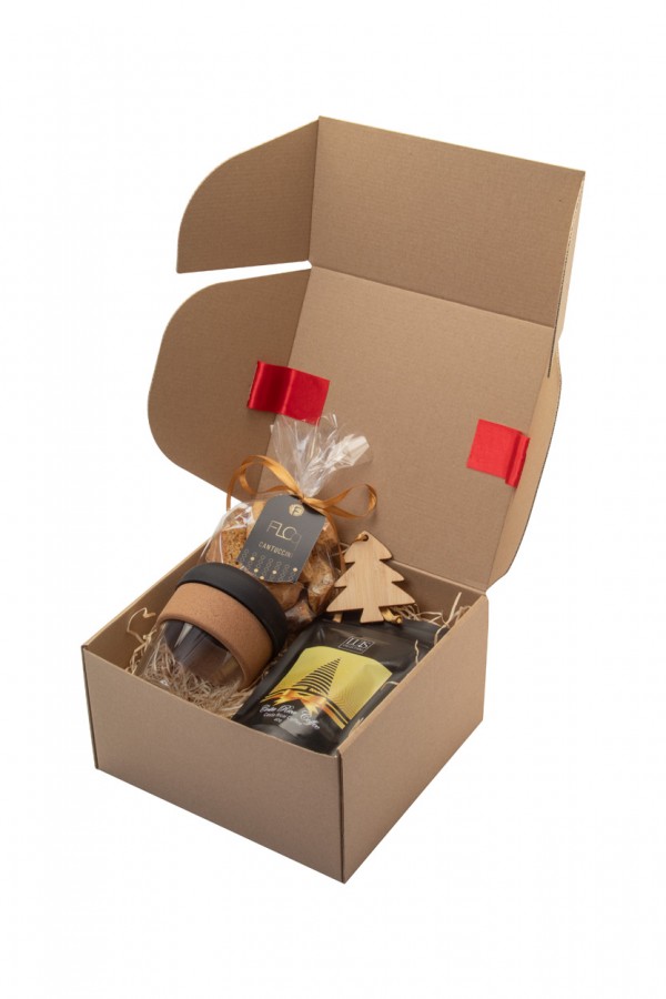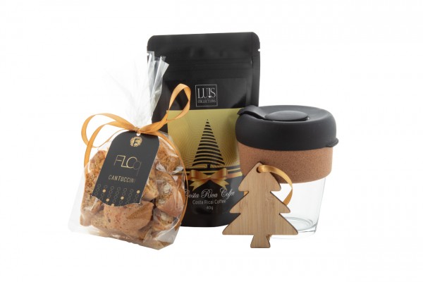 Set cadou cu cafea, în cutie cadou din carton kraft, cu umplutură de lână de lemn și panglică roșie. Include: cană de călătorie din sticlă „Tarkol”; Cafea "Luis" Costa Rica (40 g); cantuccini artizanali „Floq” (100g); Ornament pentru brad "Holonda".