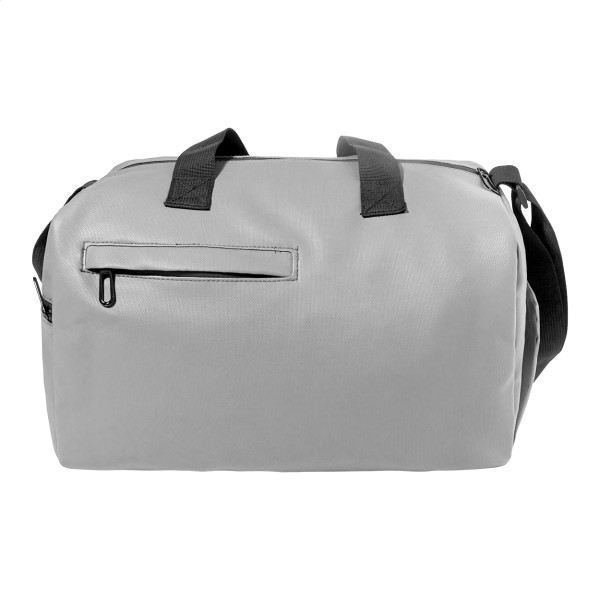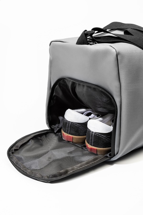 Geantă sport impermeabilă, din RPET, cu compartiment principal cu fermoar, buzunar frontal cu fermoar, compartiment pentru încălțăminte cu fermoar și curea de umăr reglabilă. Poliester RPET 600D acoperit cu PU, cu etichetă RPET distinctivă.