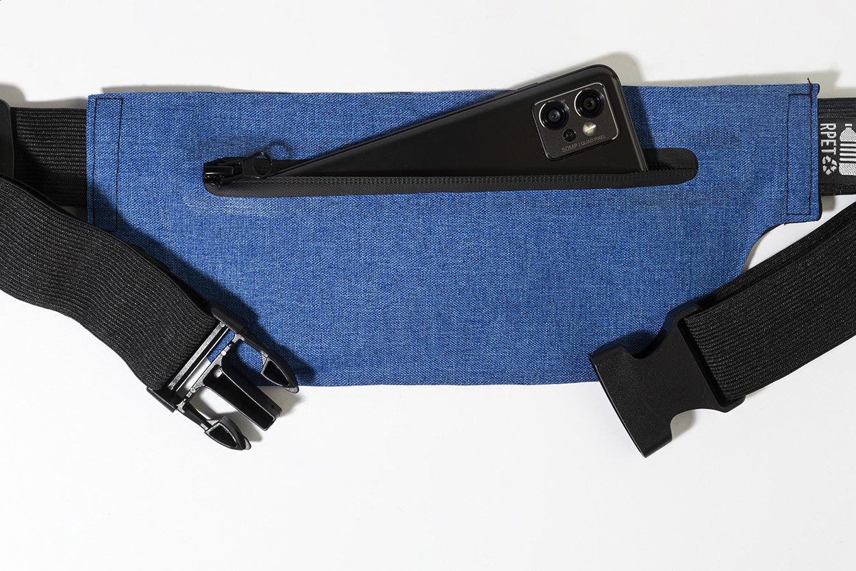 Borsetă slim, din RPET, cu compartiment cu fermoar și curea elastică reglabilă. Poliester RPET 300D, cu etichetă RPET distinctivă.