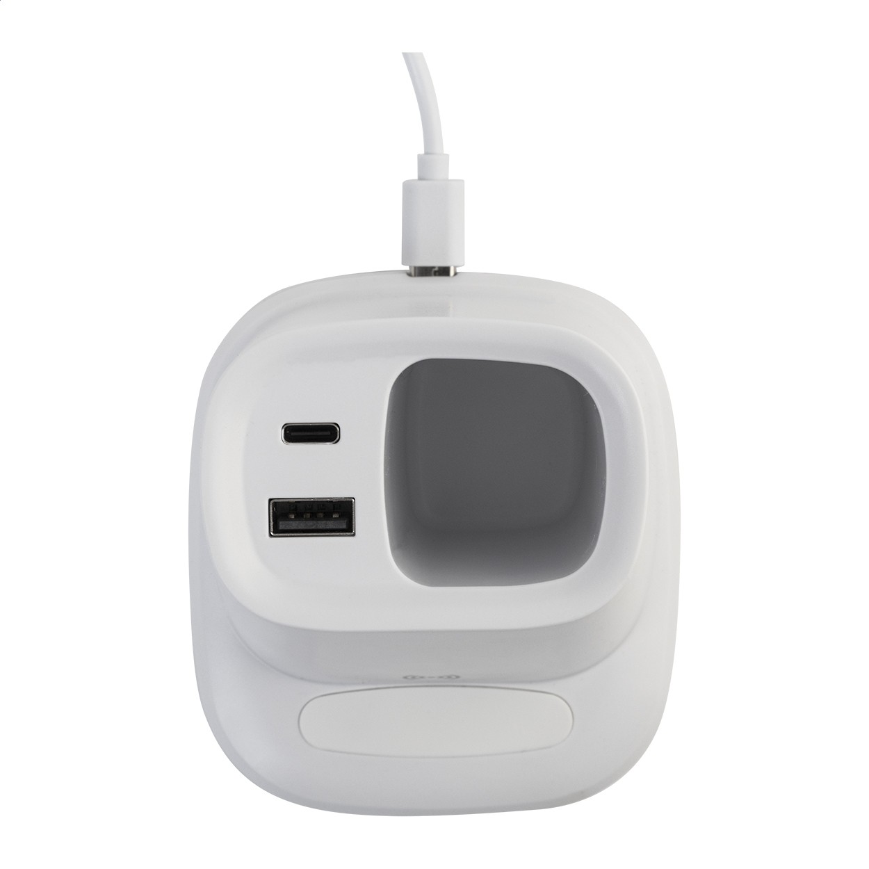 Suport multifuncțional pentru birou, din ABS reciclat, cu suport pentru telefon mobil, încărcător rapid wireless încorporat (10 W), 1 port USB și 1 port USB-C. Include cablu de încărcare USB.