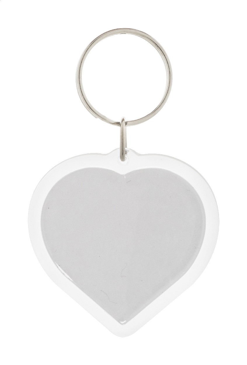 Breloc acrilic în formă de inimă, cu inserție de hârtie personalizată color și inel metalic. Prețul include imprimare digitală pe ambele părți. MOQ: 100 buc.