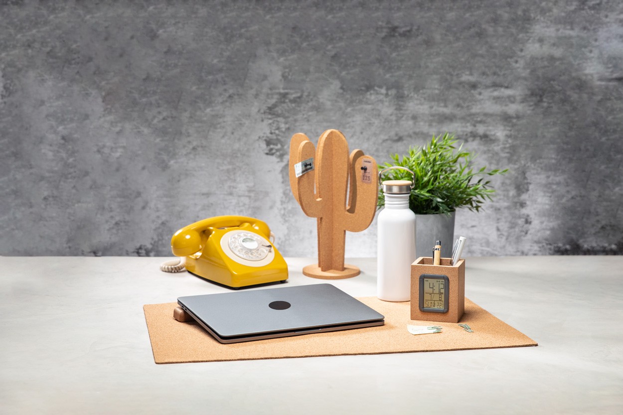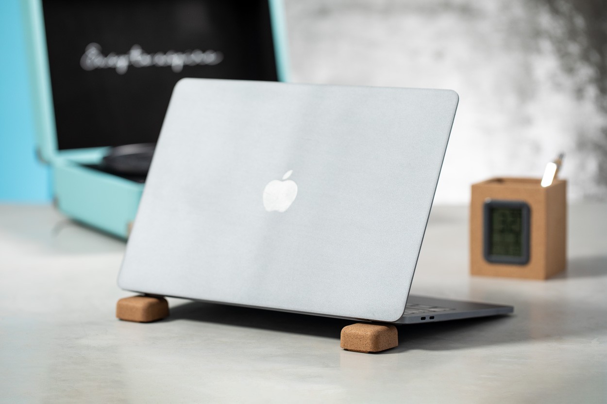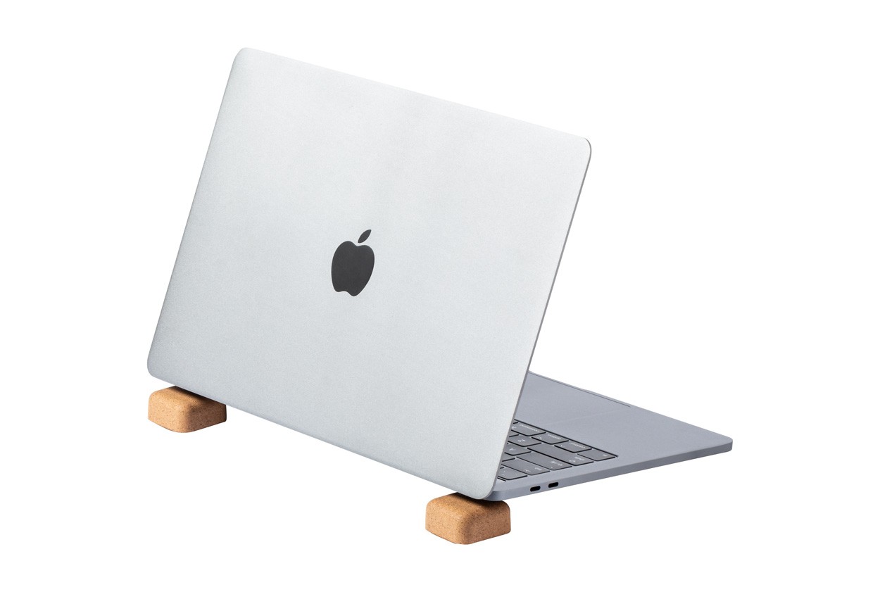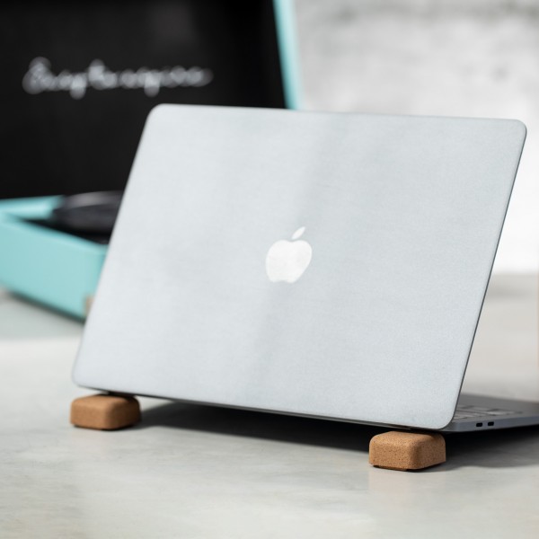 Magnetic laptop holder made of natural cork.
