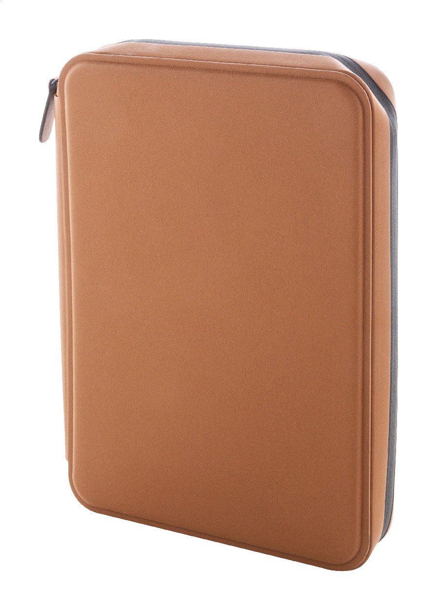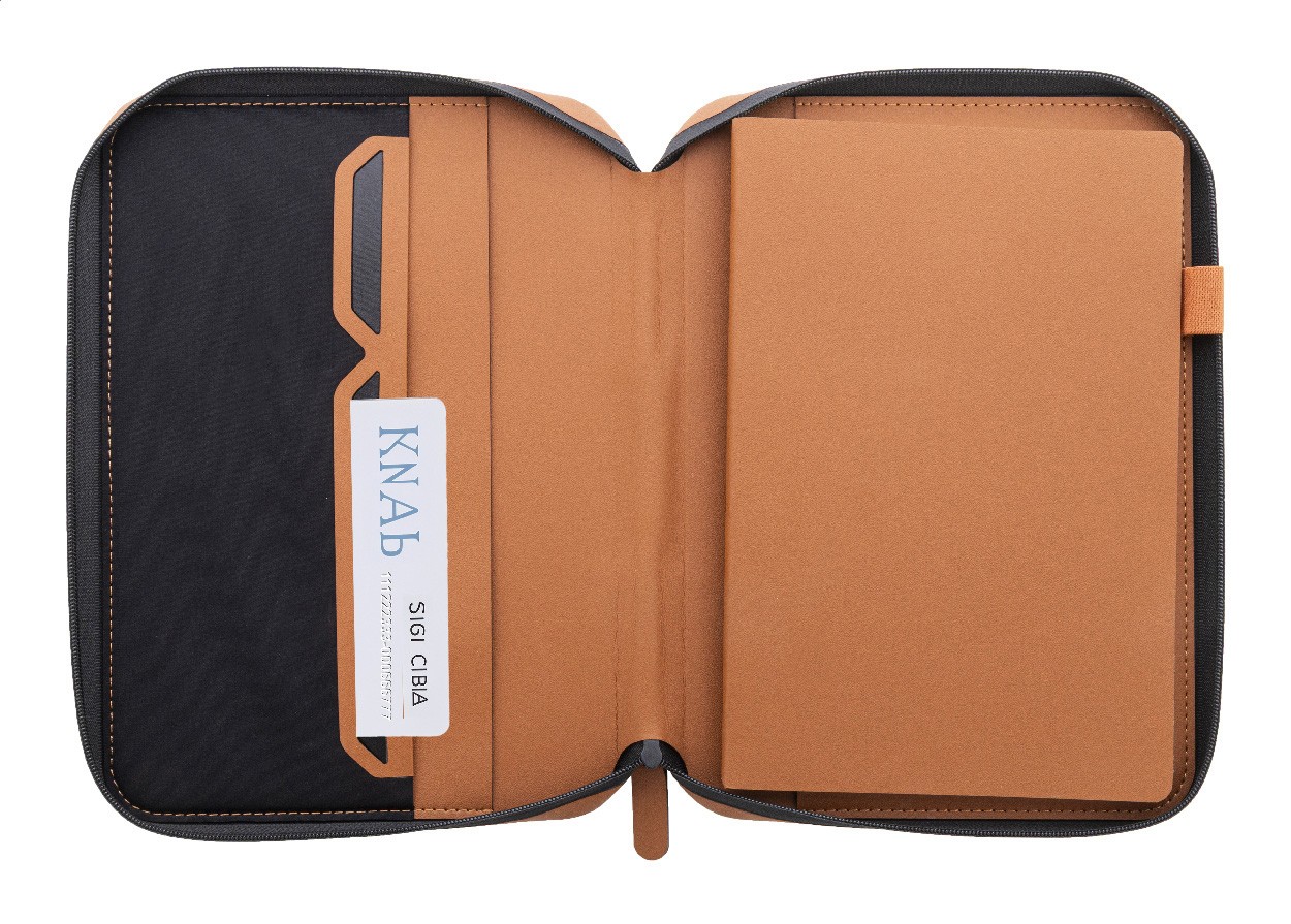 Mapă documente, de lux, cu fermoar pentru documente, din piele PU reciclată, cu blocnotes cu 64 de foi dictando din hârtie reciclată. Prezintă mai multe buzunare interioare pentru cărți de vizită și documente. Dimensiune A5.