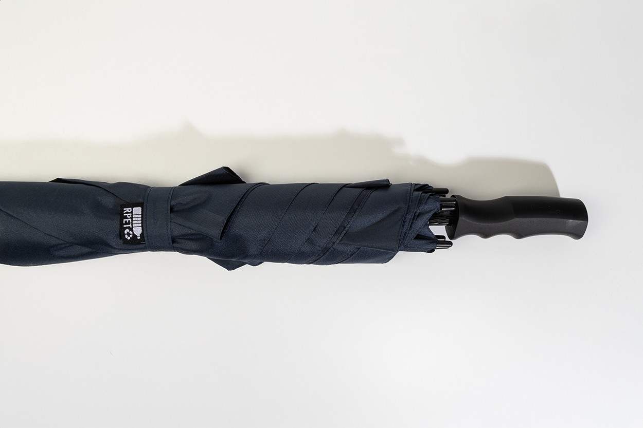 Umbrelă pătrată automată, rezistentă la vânt, de dimensiuni mari, cu ax și cadru din fibră de sticlă, mâner din ABS cauciucat. Pongee 190T RPET. Cu etichetă RPET distinctivă.