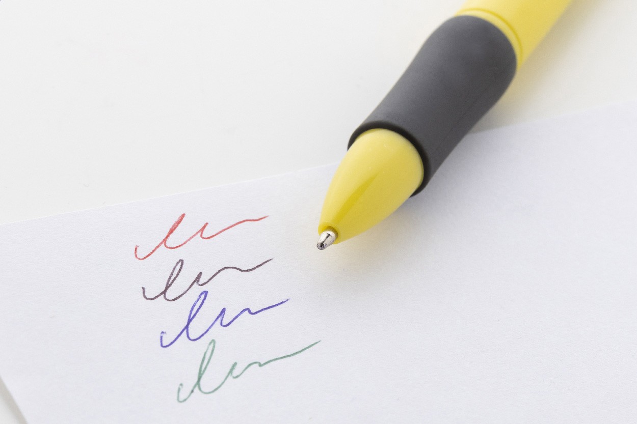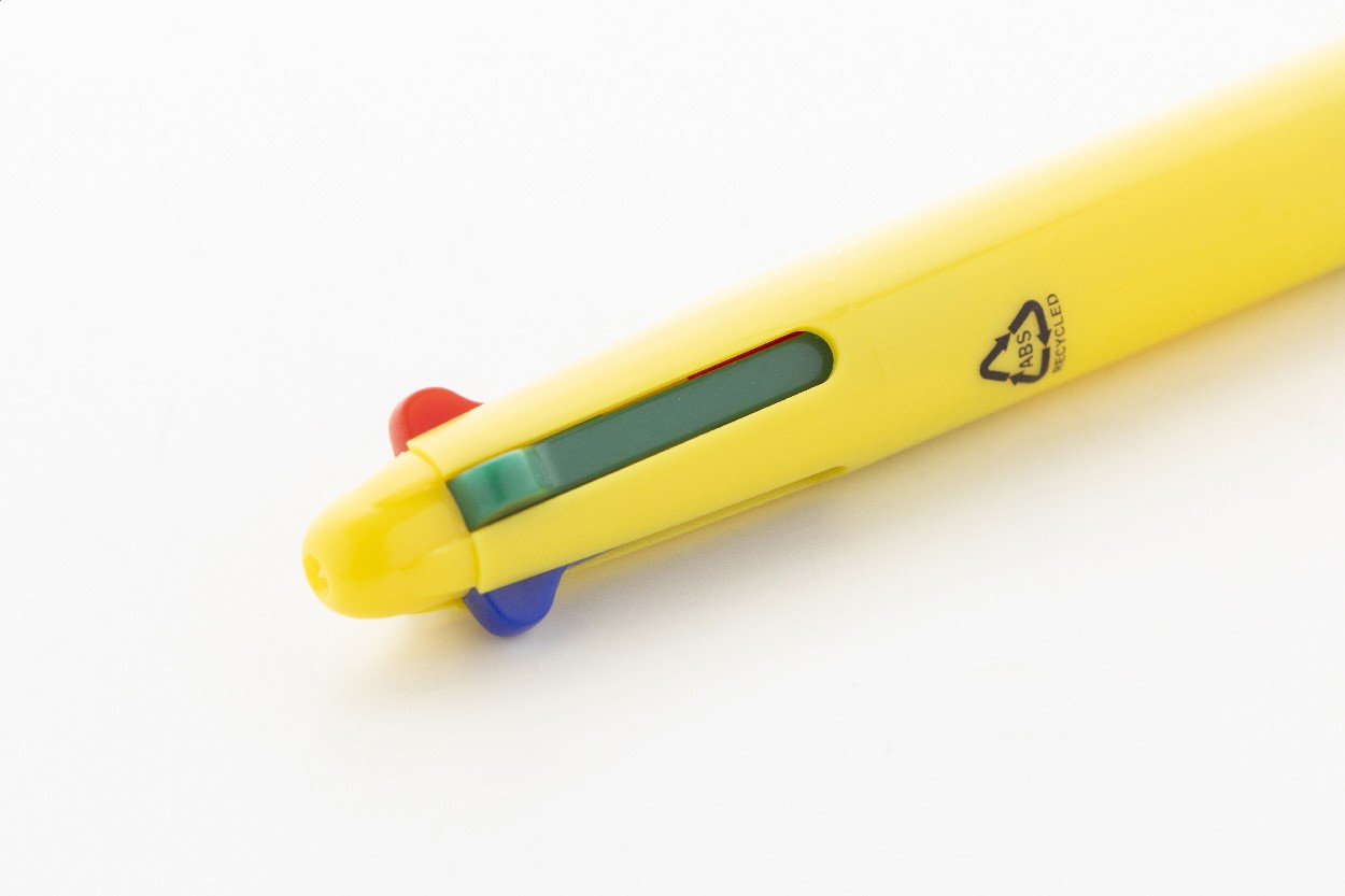 Pix cu bilă, multicolor, din ABS reciclat, cu mâner din cauciuc. Cu rezerve negre, albastre, roșii și verzi.