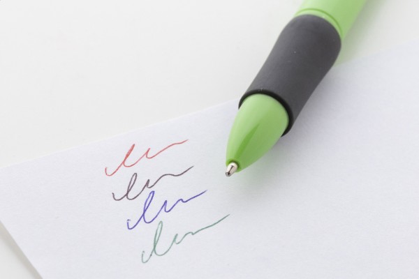Pix cu bilă, multicolor, din ABS reciclat, cu mâner din cauciuc. Cu rezerve negre, albastre, roșii și verzi.