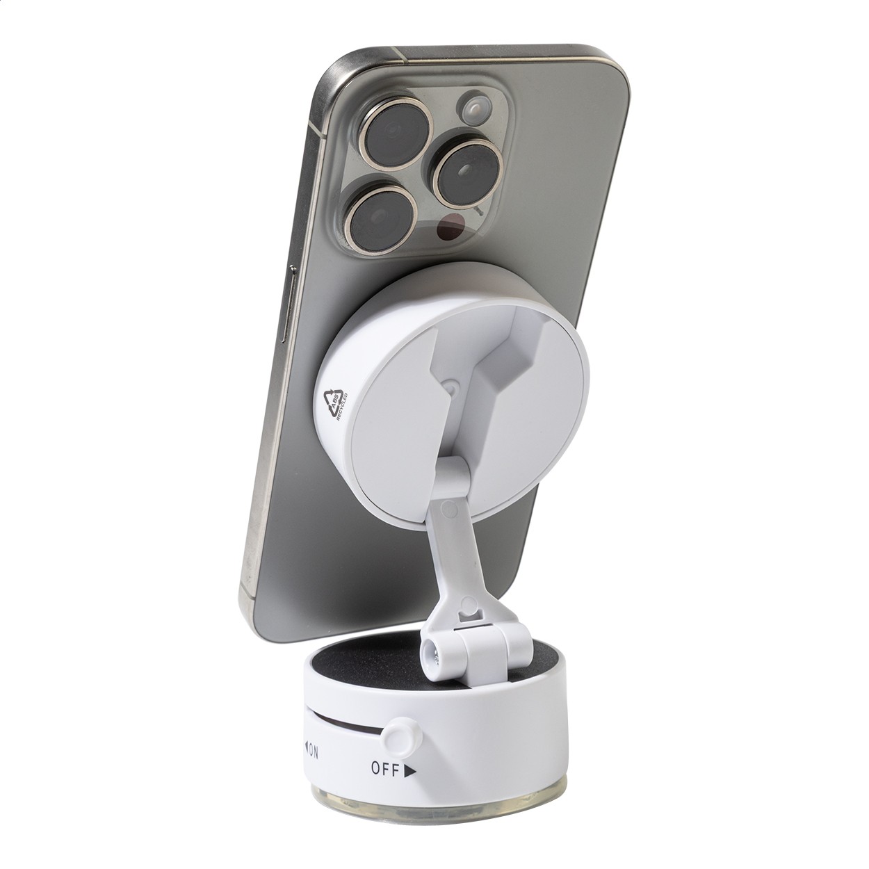 Suport magnetic pentru telefonul mobil, din ABS reciclat, cu fixare prin ventuză. Include inel metalic autoadeziv pentru telefoane fără suprafață magnetică.
