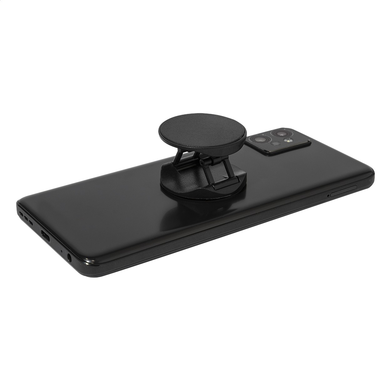 Suport telefon mobil, din ABS reciclat, de formă rotundă, cu bază autoadezivă.