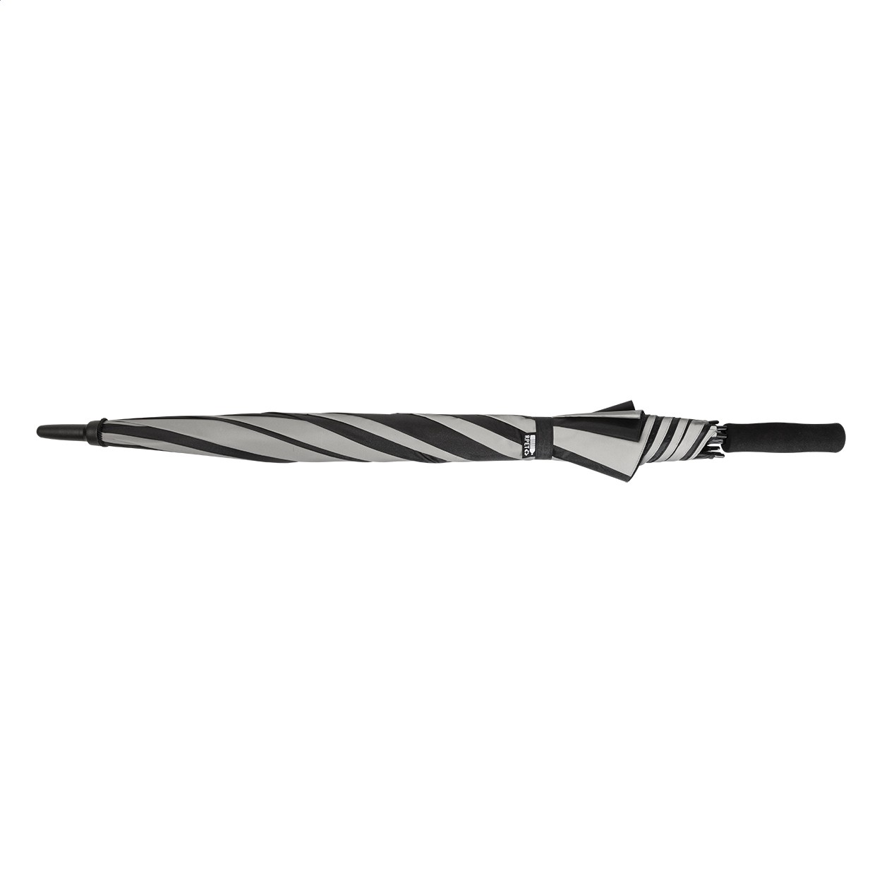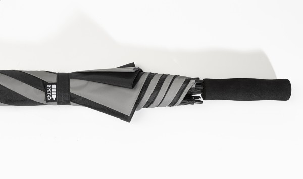 Umbrelă manuală, rezistentă la vânt, de dimensiuni mari, cu 4 panouri din pongee RPET 190T și 4 panouri din țesătură reflectorizantă. Cu cadru și ax complet din fibră de sticlă, mâner din EVA. Pongee RPET 190T. Cu etichetă RPET distinctivă.