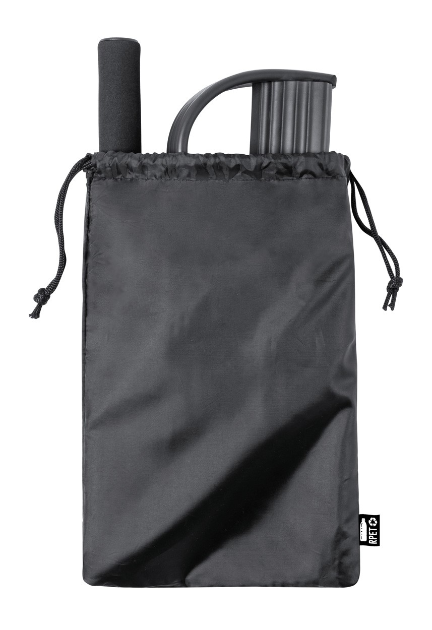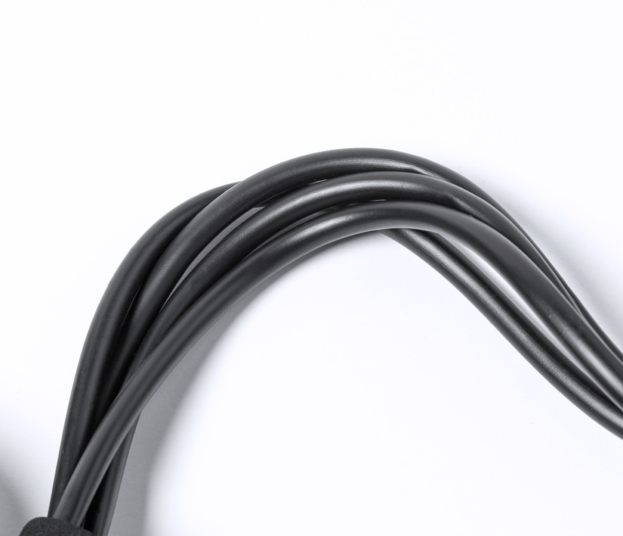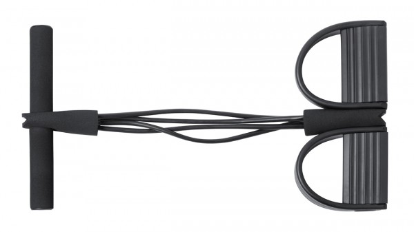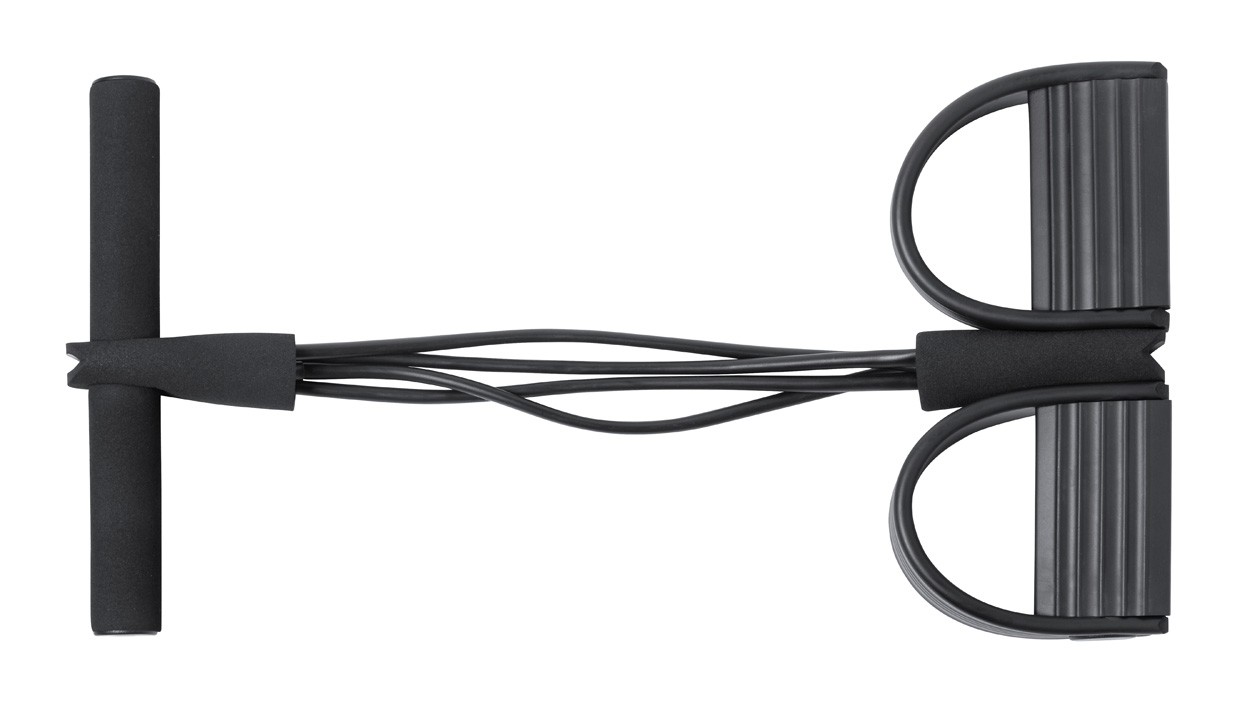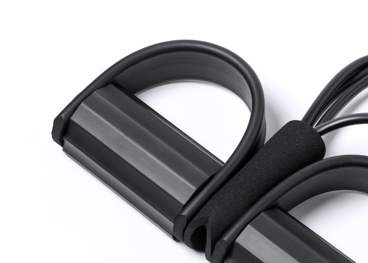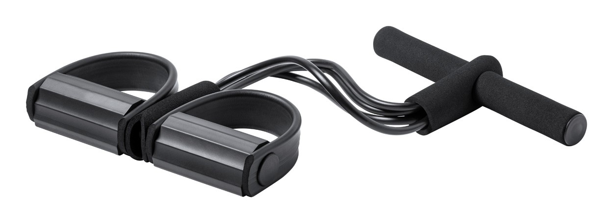Bandă de exerciții de rezistență medie, din cauciuc TPE, cu mânere căptușite și suporturi pentru picioare din plastic EVA și ABS. În husă din poliester RPET.
