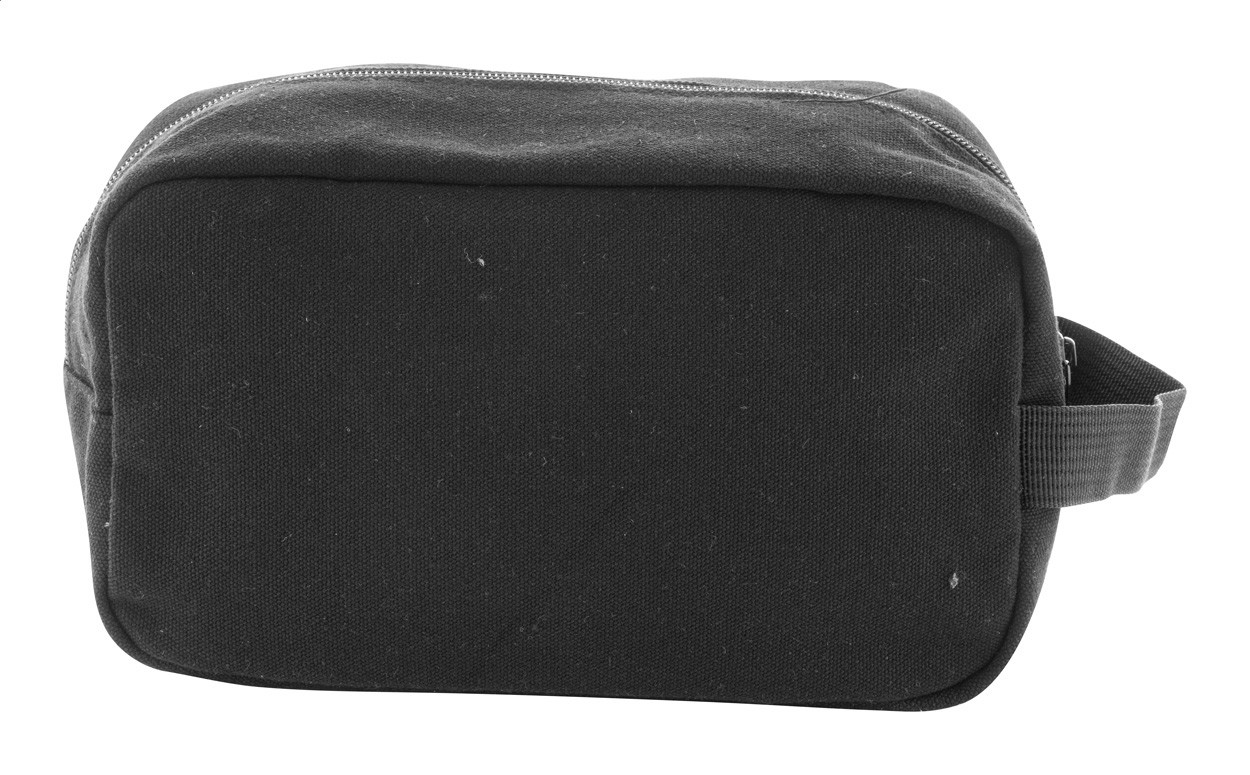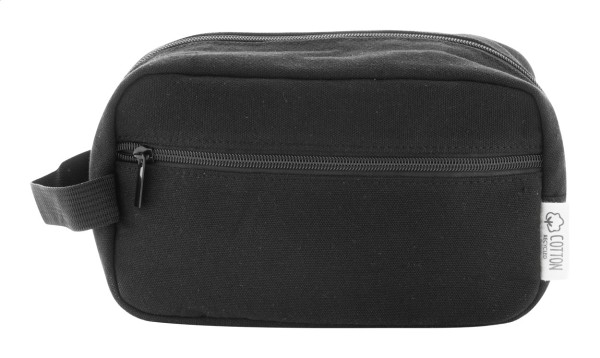 Geantă pentru cosmetice, din pânză reciclată, cu două compartimente cu fermoar și mâner de transport. 70% bumbac reciclat și 30% poliester RPET. Cu etichetă distinctivă din bumbac reciclat.