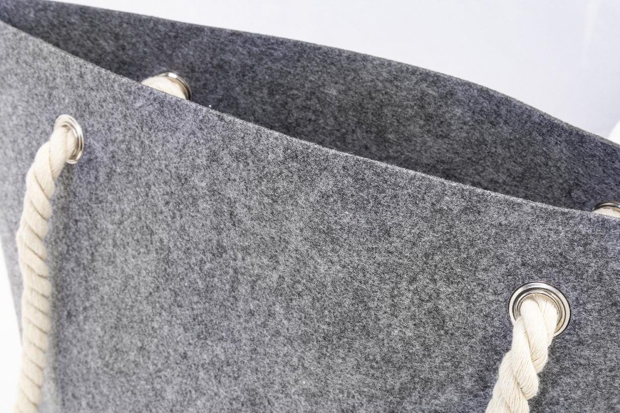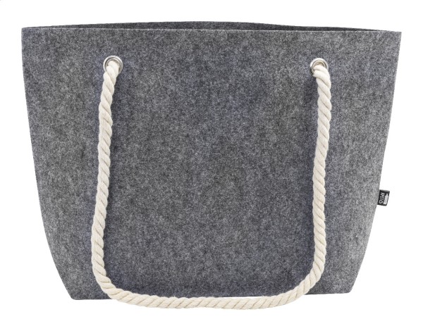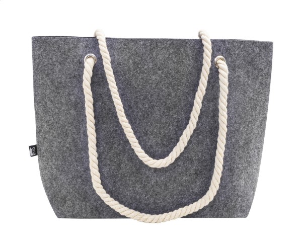 Geantă de plajă sau de cumpărături, din fetru RPET, cu mânere din șnur de bumbac și clin la bază. Cu etichetă distinctivă din RPET.