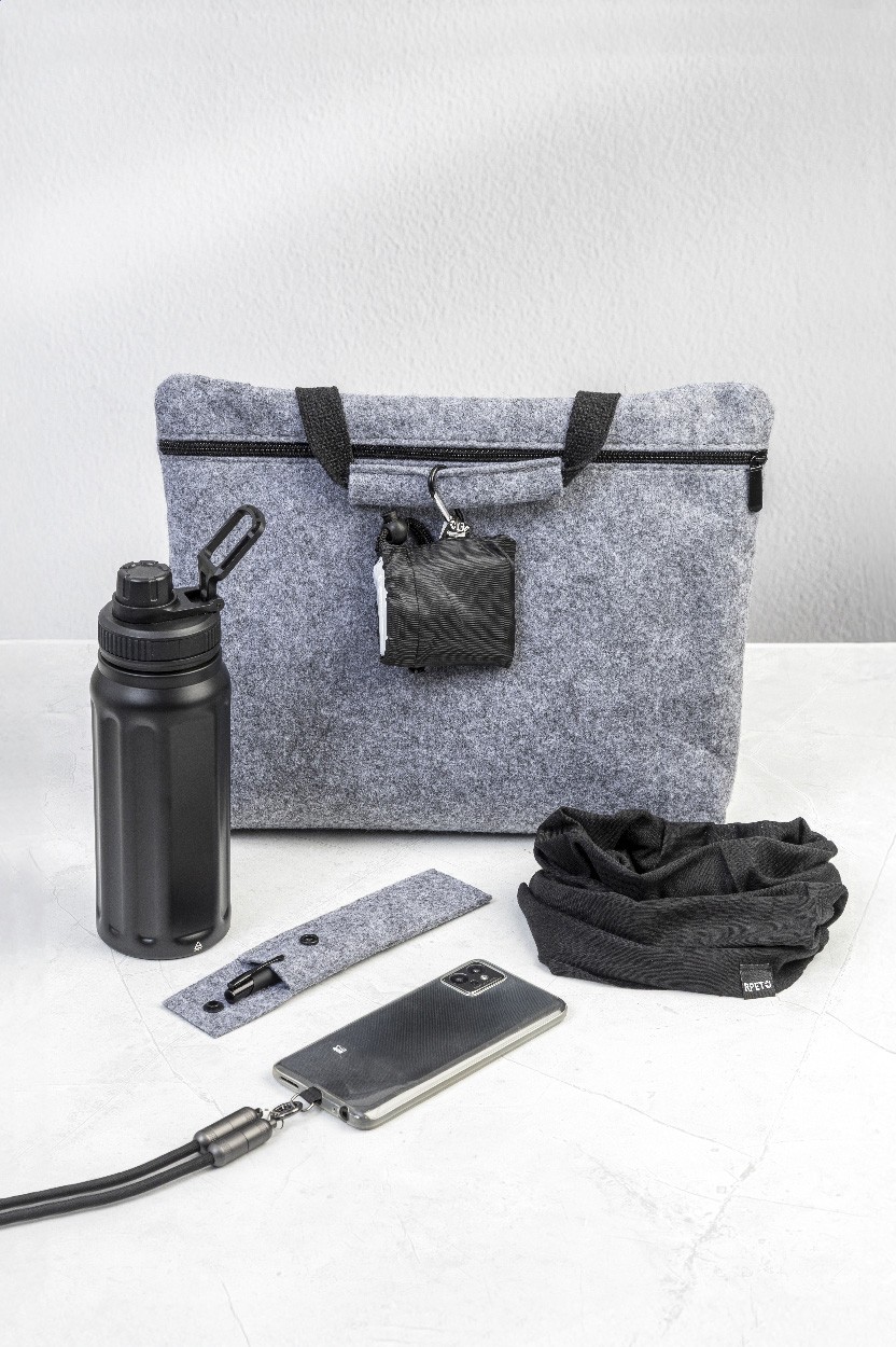 Geantă din fetru RPET, pentru documente sau laptop, cu compartiment principal cu fermoar și buzunar interior cu fermoar. Se potrivește laptopurilor de până la 15". Cu etichetă distinctivă RPET.