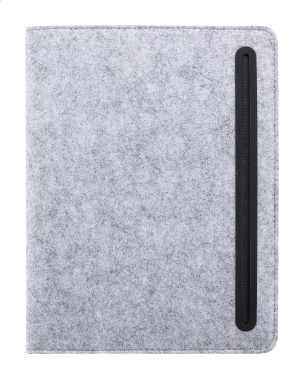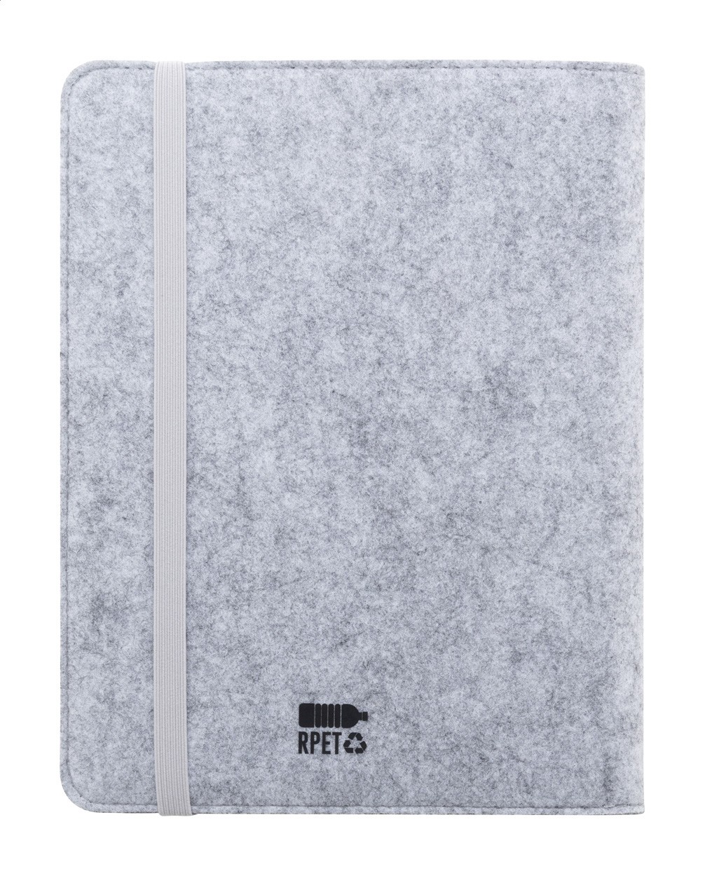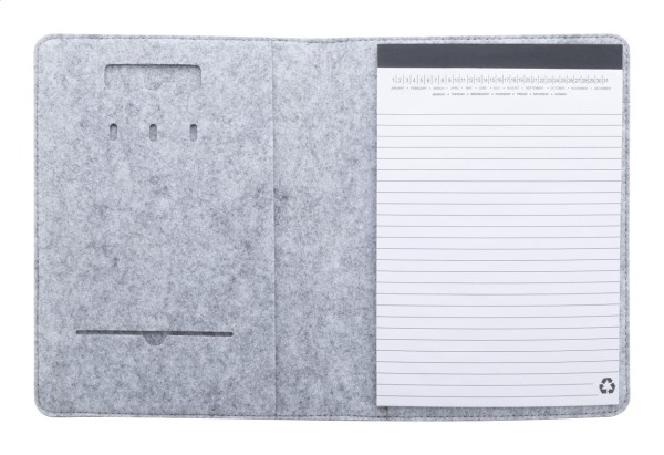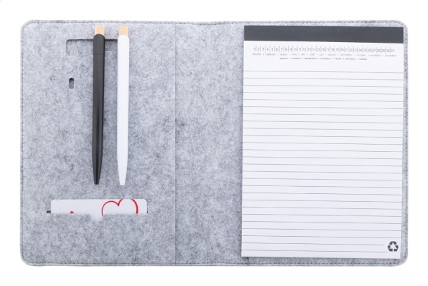 Dosar pentru documente de dimensiune A5, din pâslă RPET, cu buzunare de organizare frontale și multiple interioare. Cu blocnotes cu 20 de foi dictando din hârtie reciclată.